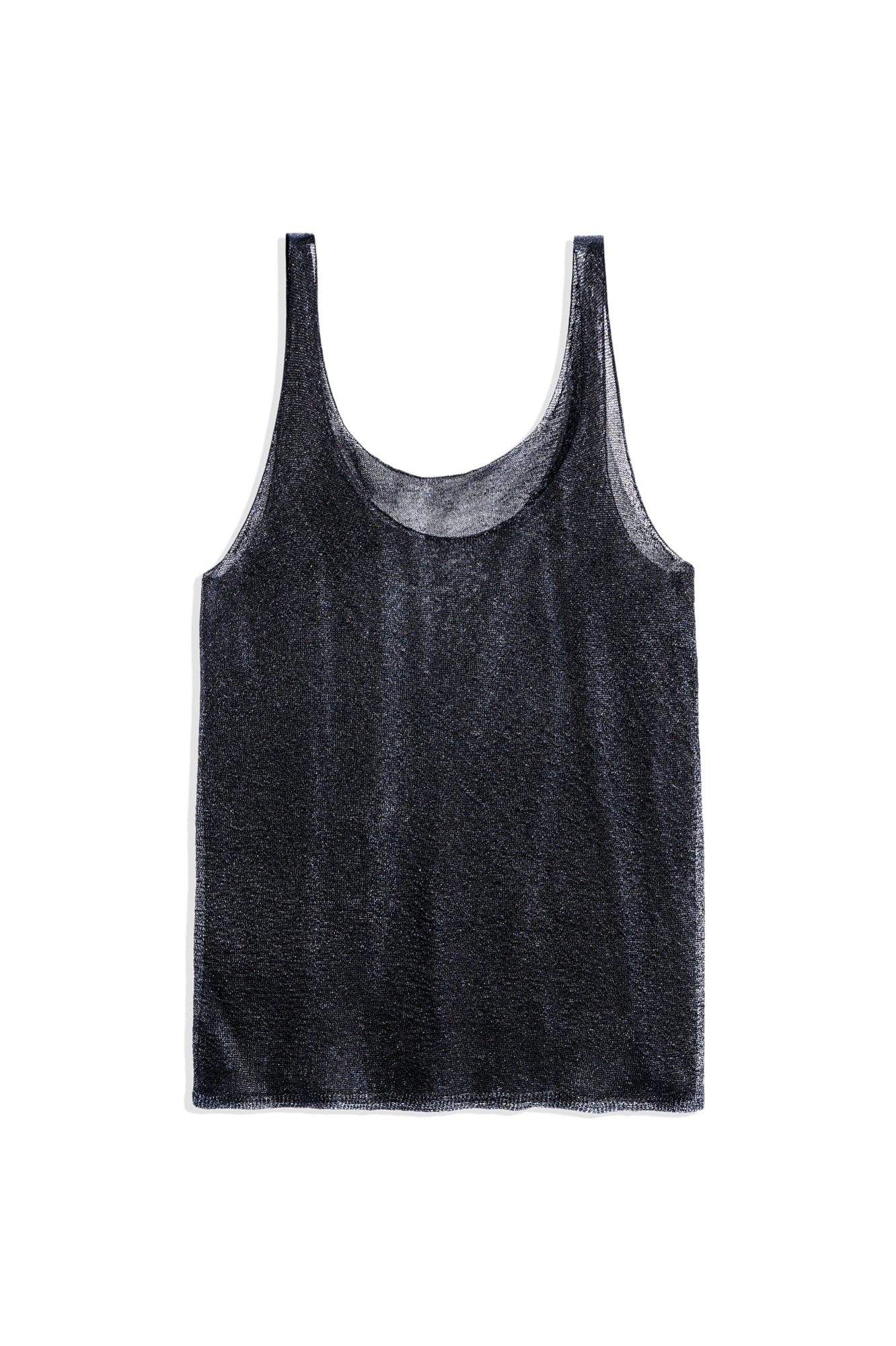 Полупрозрачная цельновязаная майка из вискозы с добавлением люрекса. Модель свободного силуэта на тонких бретельках и глубоким вырезом декольте.