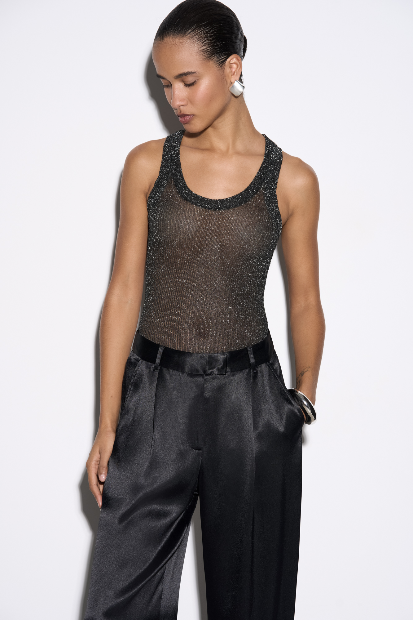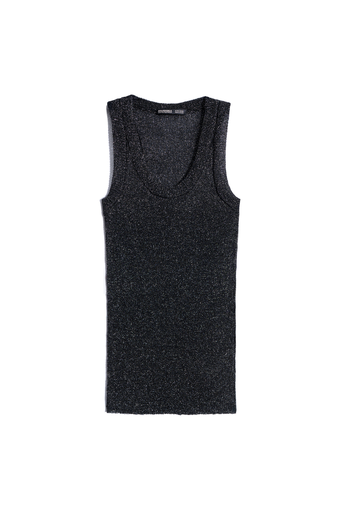 Трикотажный топ из вискозы с люрексом. Модель с U-образным вырезом горловины и широкими бретелями.