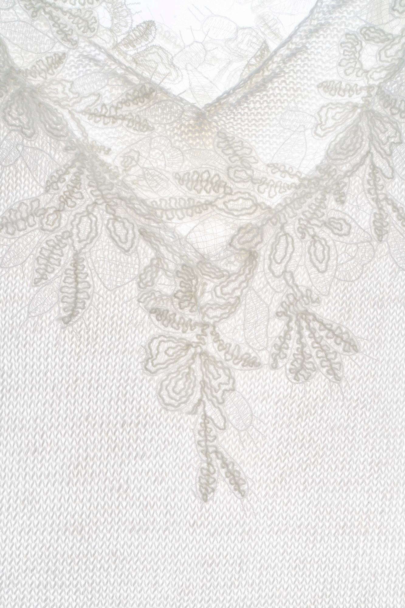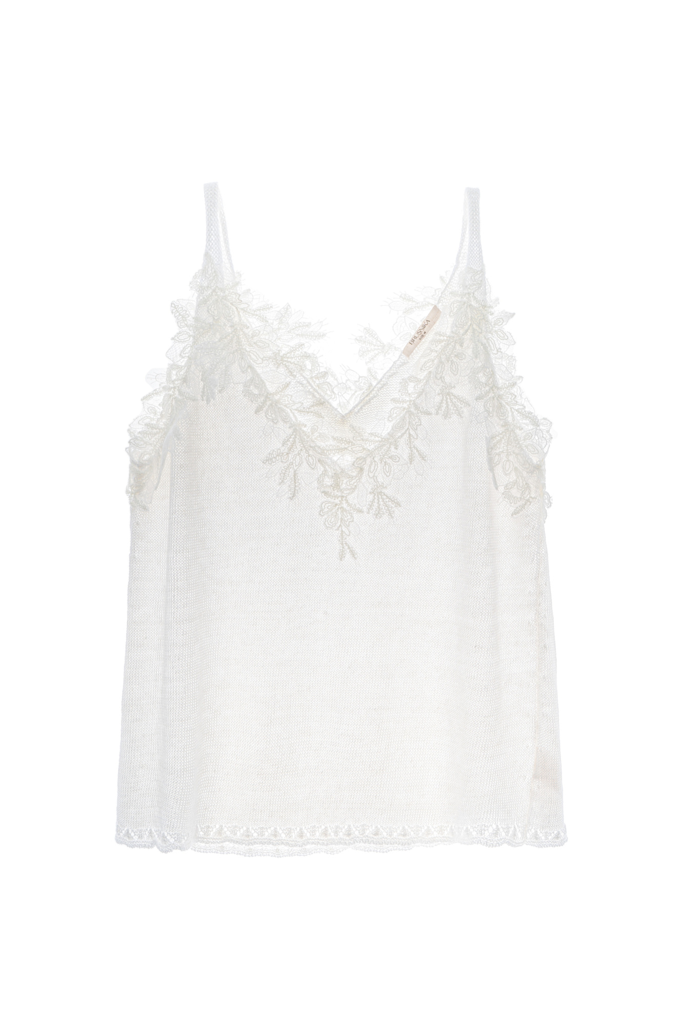 Трикотажный топ из 100% льна. Модель свободного силуэта, на тонких бретельках, глубоким V-образным вырезом, декорированным кружевом, и ажурным низом.