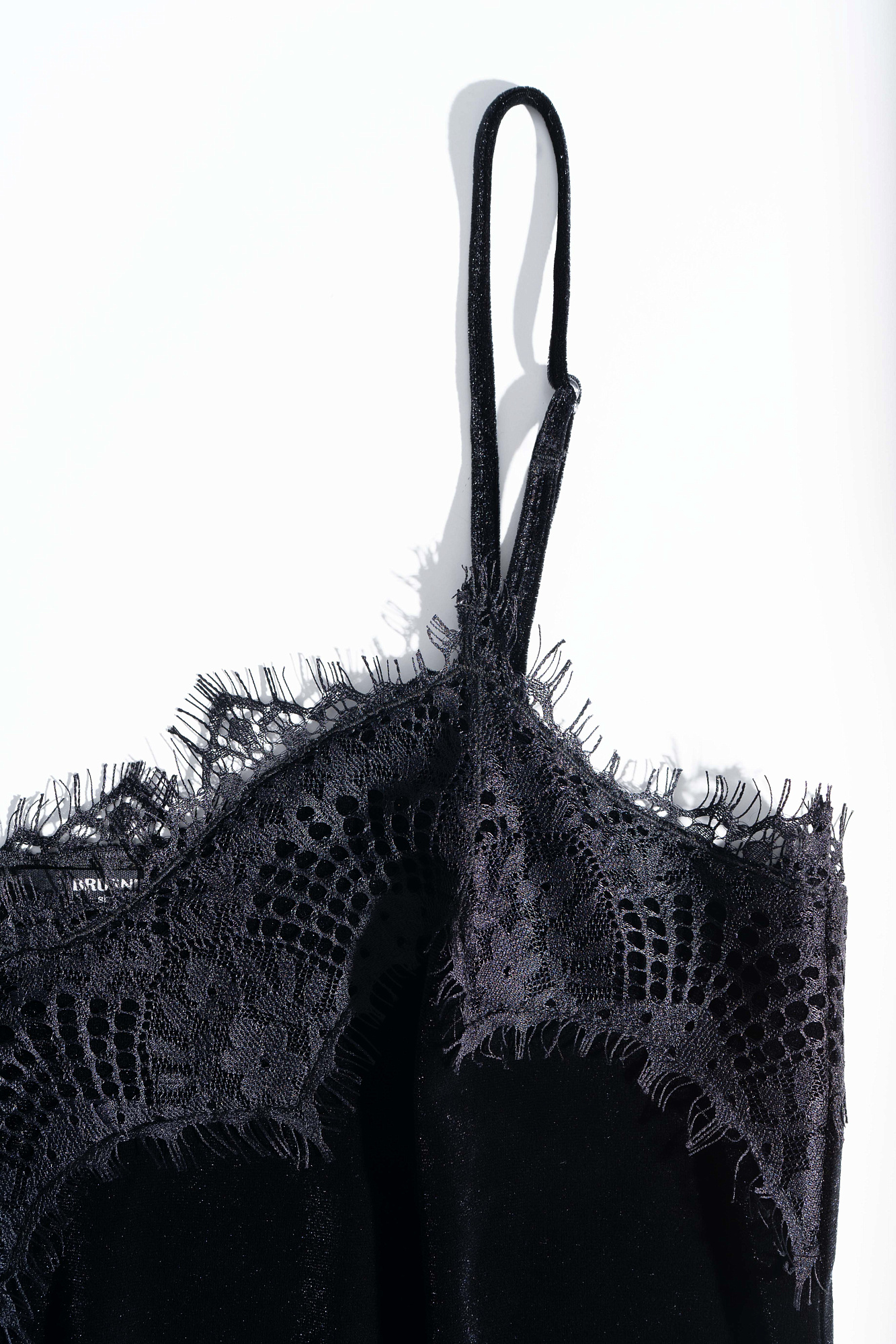 Топ из бархатной вискозы, декорированный тонким кружевом. Модель асимметричного кроя, с глубоким вырезом декольте на тонких бретельках.
