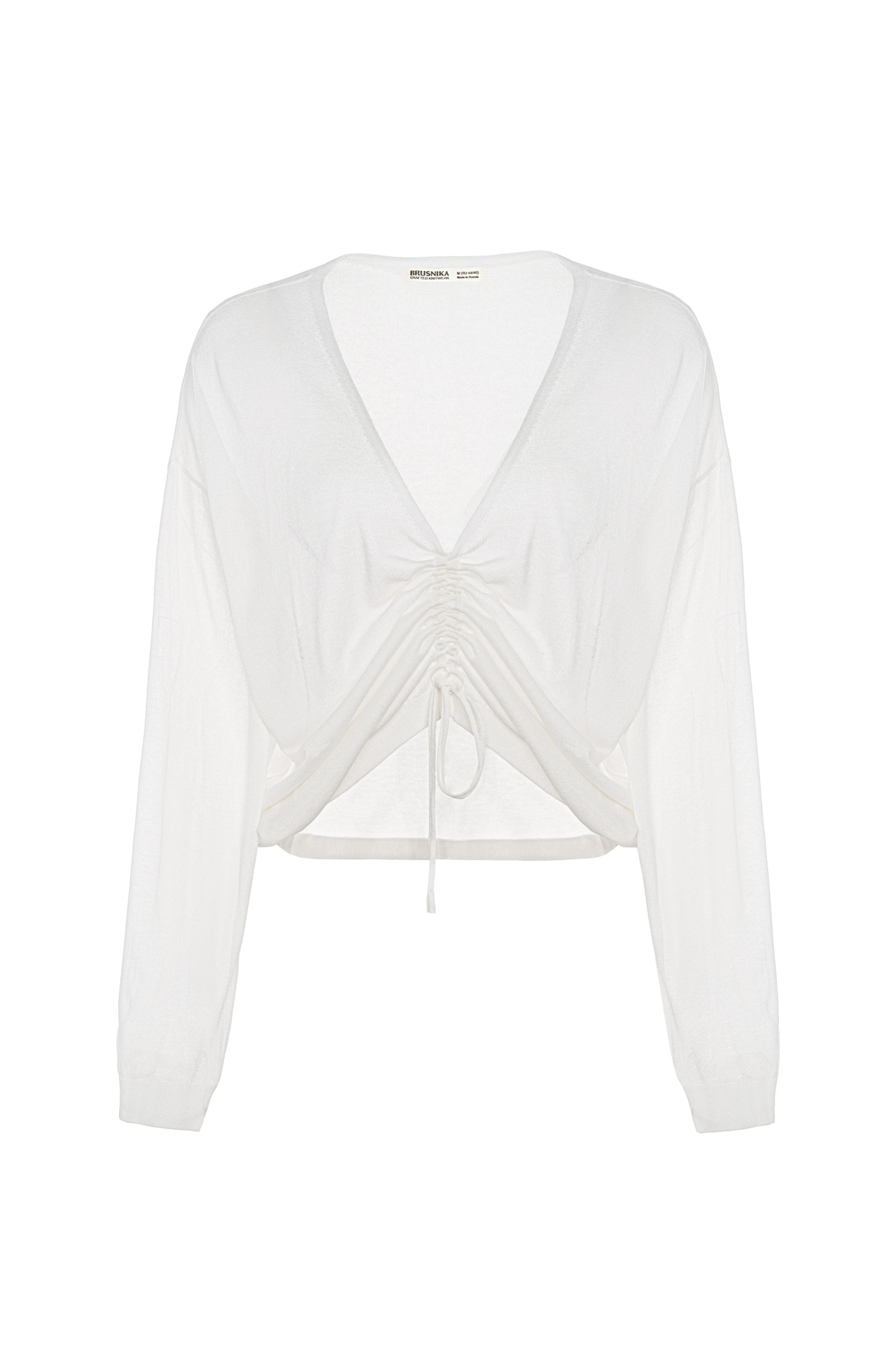 Полупрозрачный топ из тонкой вискозы. Модель свободного силуэта, с длинными рукавами и V-вырезом на кулиске.