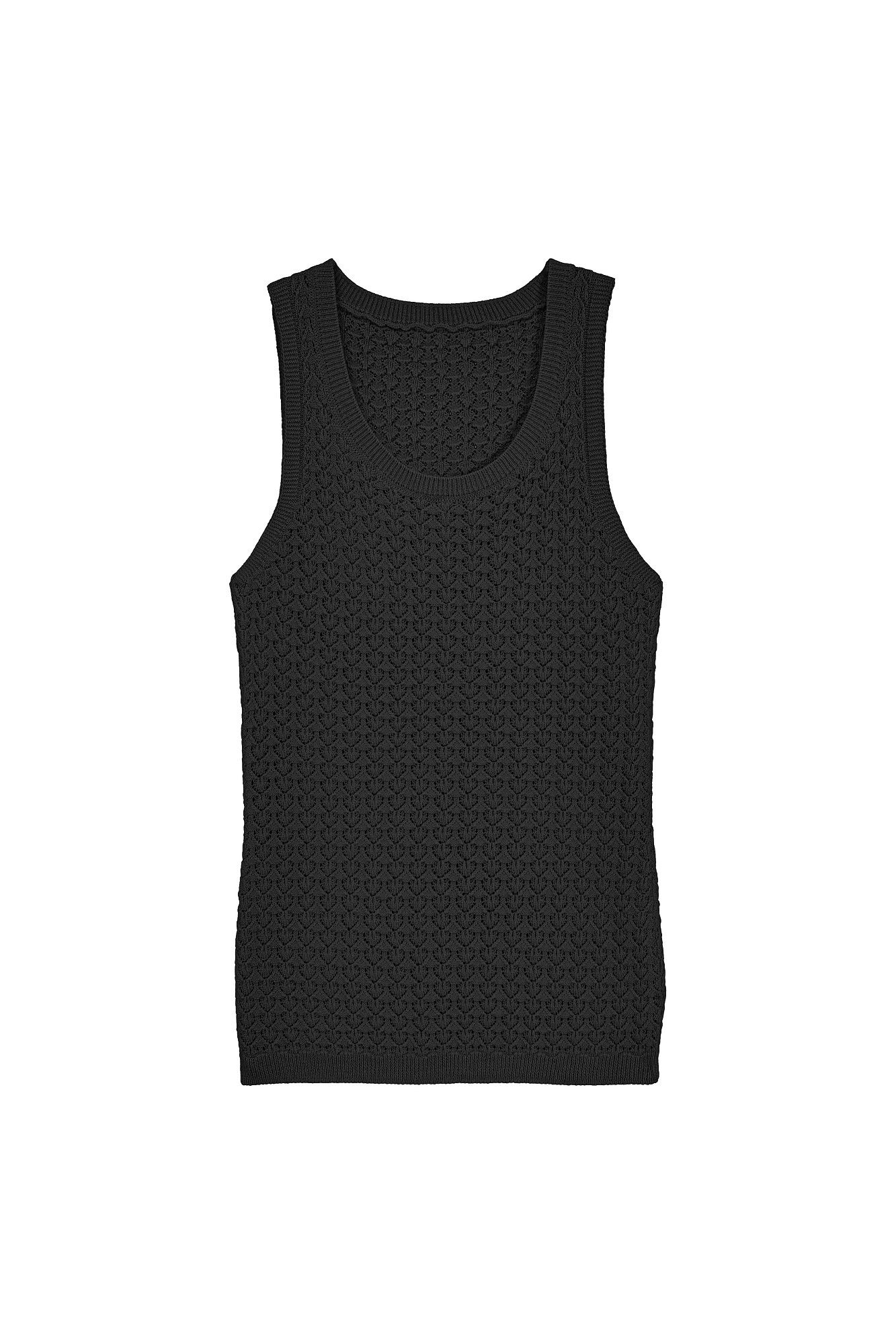 Трикотажный ажурный топ из вискозы с вывязанным орнаментом сердечками. Модель приталенного силуэта, с круглым вырезом горловины, без рукавов, на широких лямках. Края изделия выполнены в рубчик.