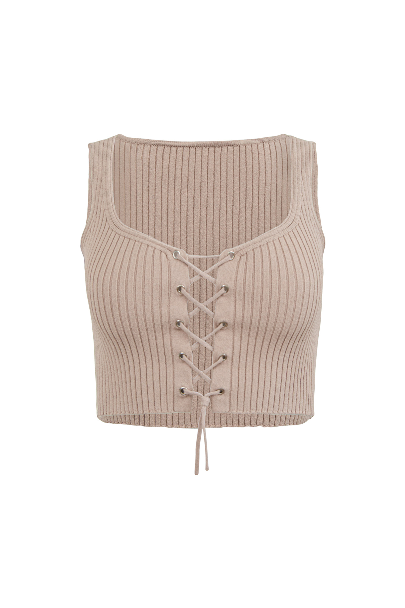 Короткий трикотажный топ из вискозы. Модель приталенного силуэта, без рукавов, на широких бретельках, с люверсами и шнуровкой на груди. Дополнить образ можно юбкой в таком же стиле.