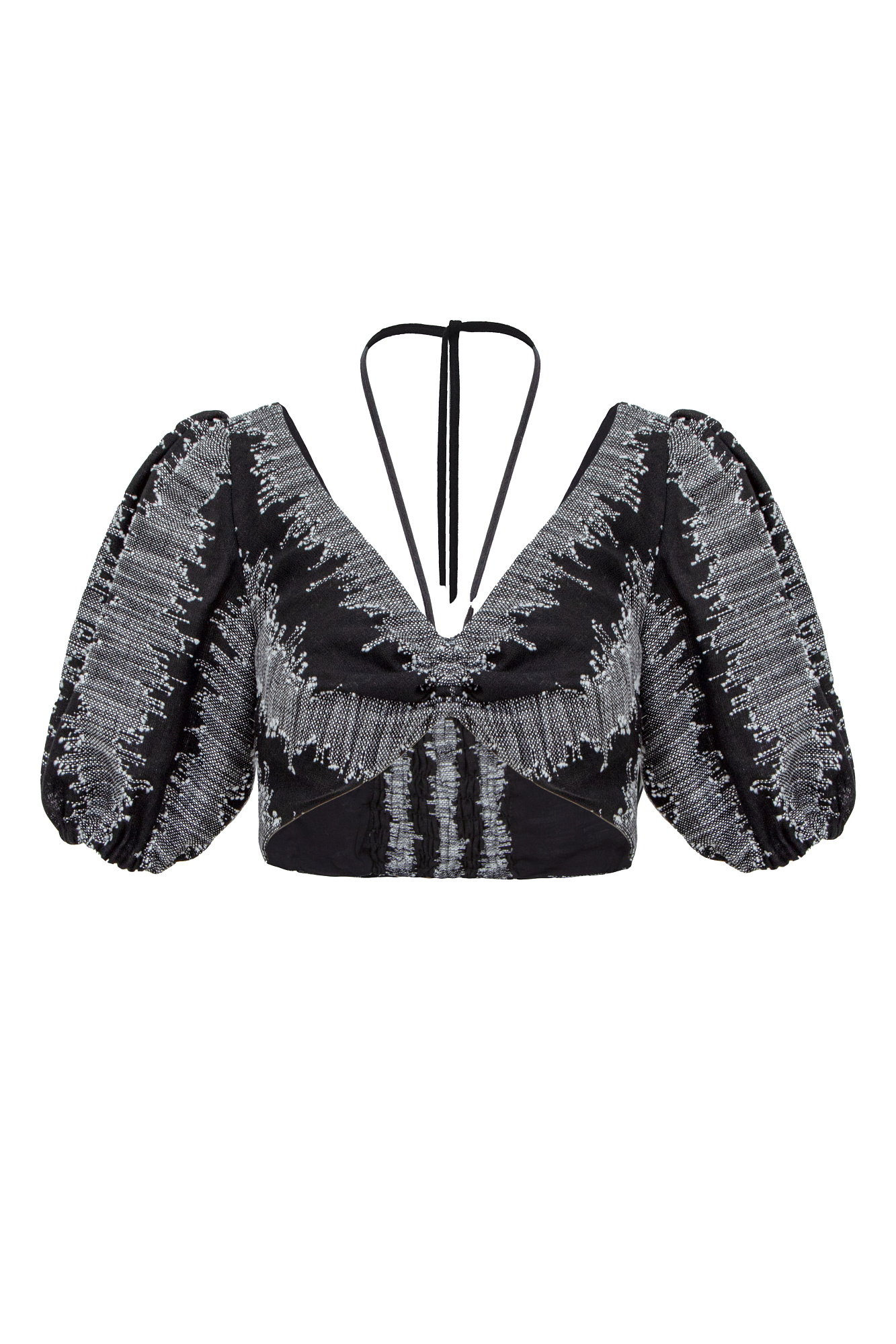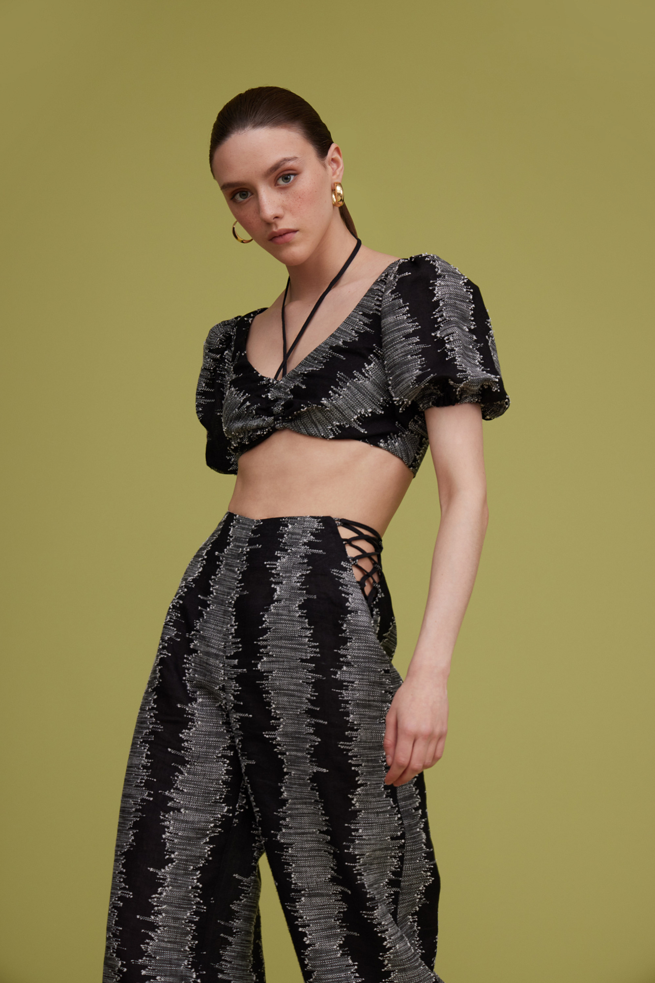 Короткий топ из 100% текстурного льна. Модель с коротким рукавом-фонариком, глубоким вырезом декольте и тонкой кулиской вокруг шеи.