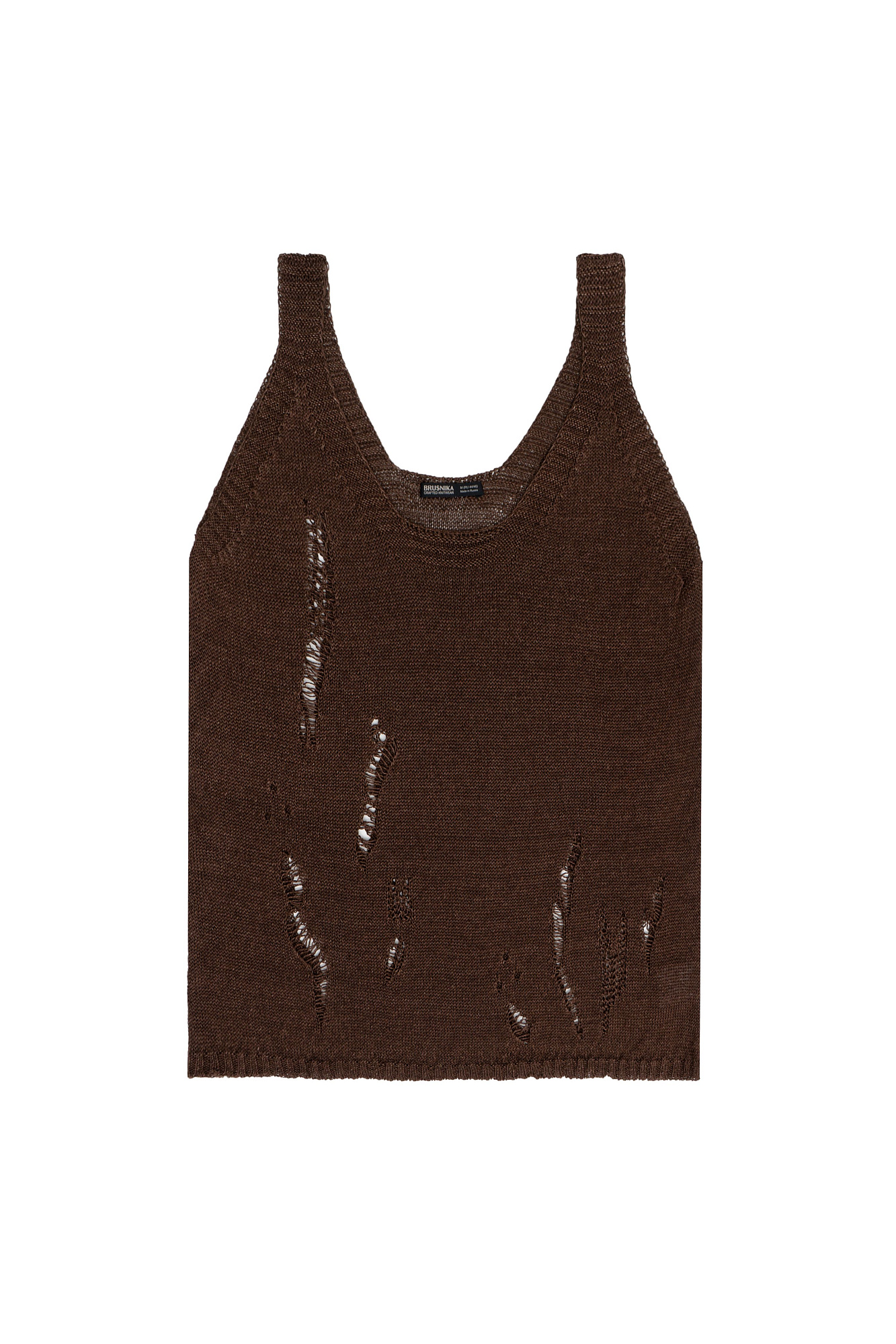 Трикотажный топ из 100% льна. Модель свободного силуэта, с глубокой проймой и U-вырезом горловины. Изделие выполнено с эффектом рвани.