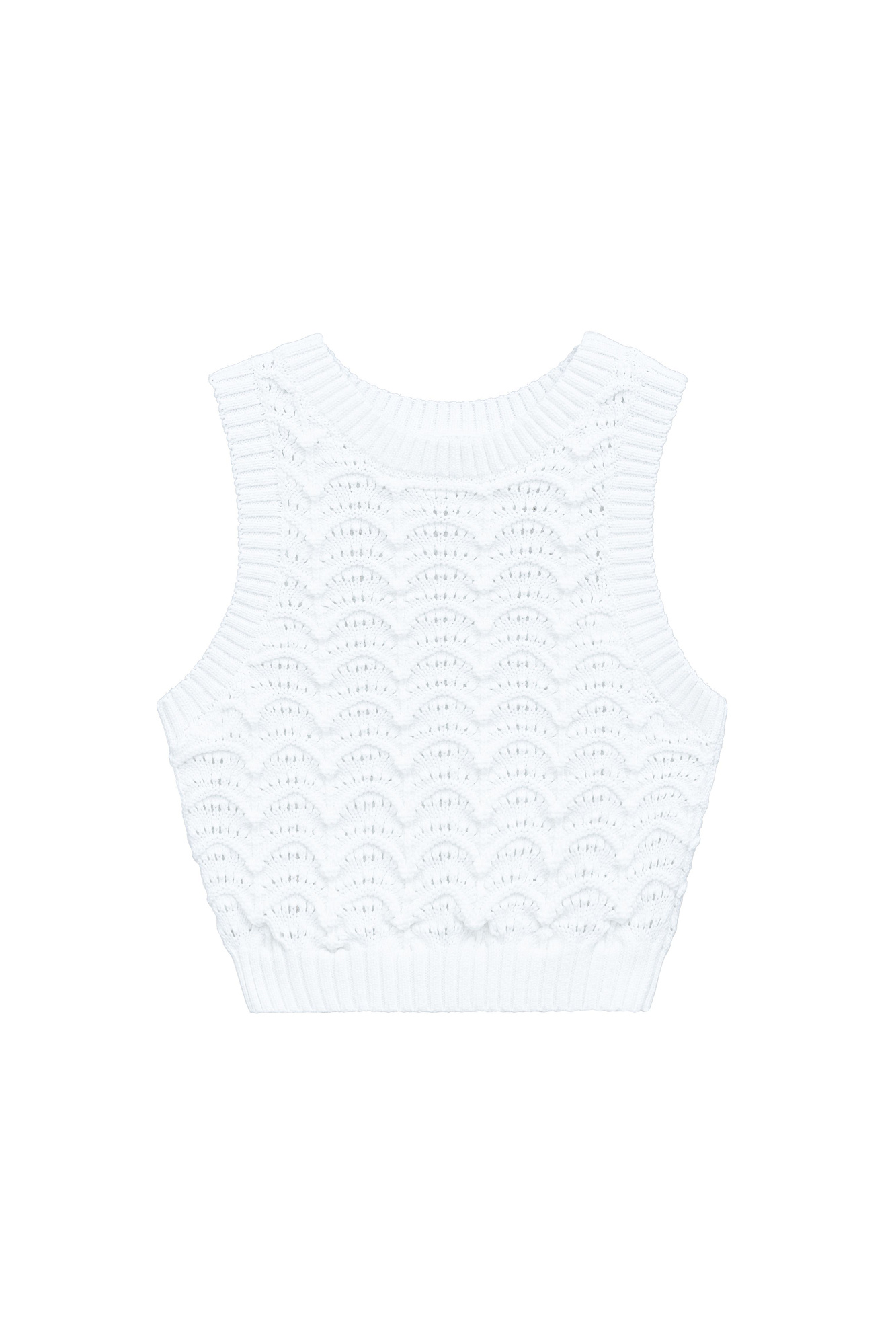 Трикотажный ажурный топ из хлопка с добавлением эластана. Модель приталенного силуэта, без рукавов, с неглубоким круглым вырезом горловины. Изделие выполнено объемным вязанием с волнистым узором и краями в рубчик.