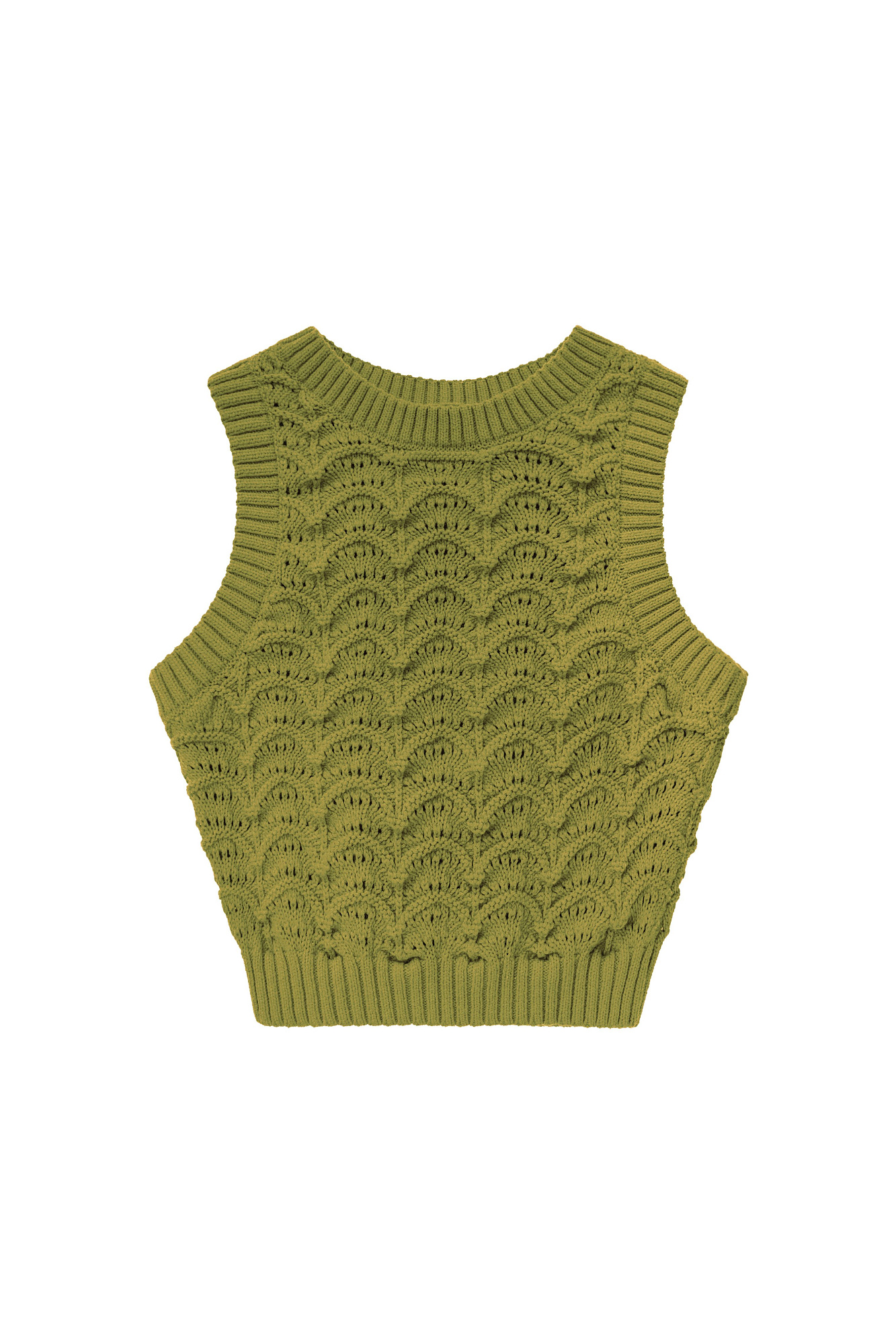 Трикотажный ажурный топ из хлопка с добавлением эластана. Модель приталенного силуэта, без рукавов, с неглубоким круглым вырезом горловины. Изделие выполнено объемным вязанием с волнистым узором и краями в рубчик.