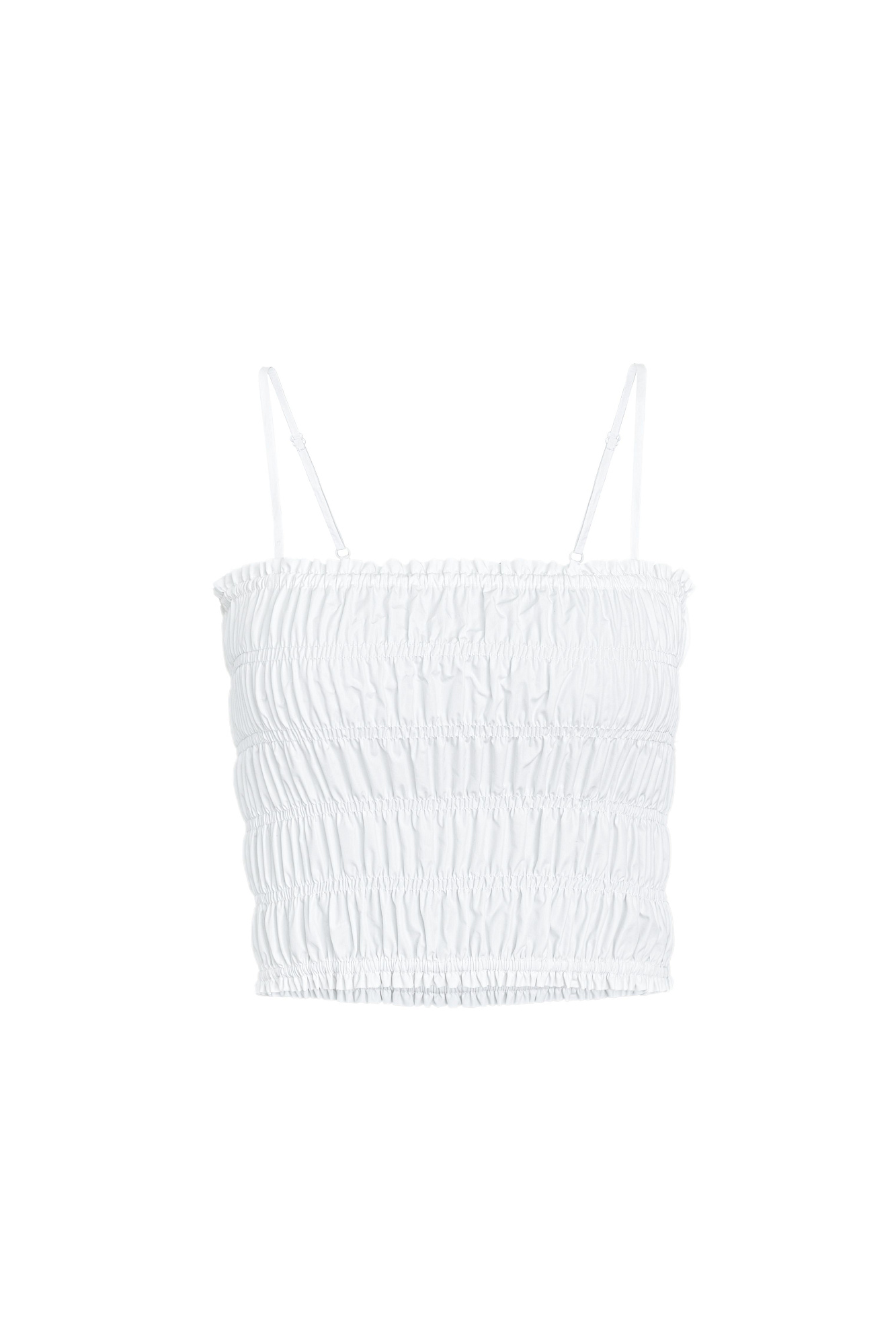 Топ с эластичными сборками на тонких регулируемых бретелях. Дополнить образ можно юбкой в таком же стиле.