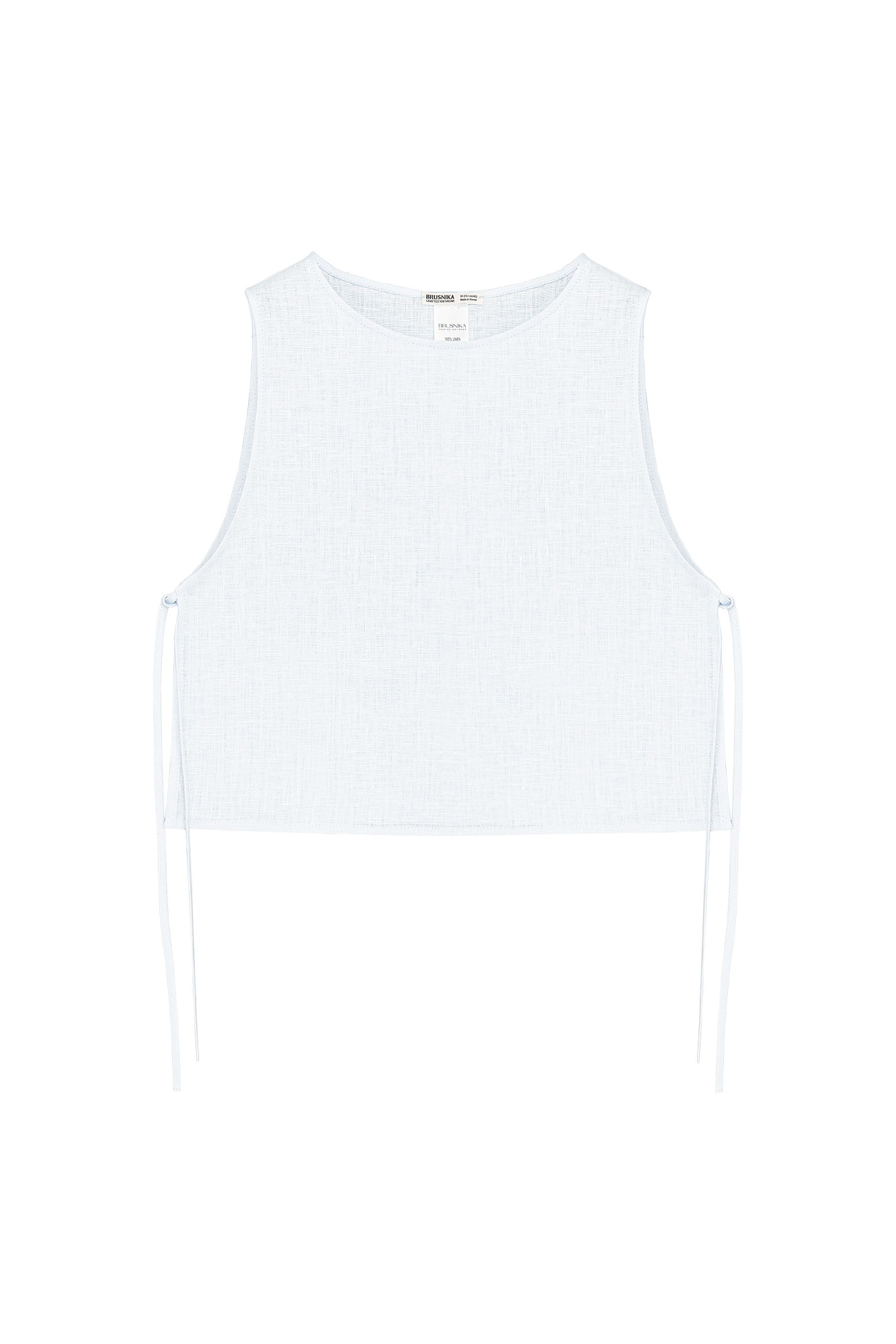 Укороченный топ из 100% льна. Модель свободного кроя, без рукавов, с круглым вырезом горловины. Изделие фиксируется завязками по бокам.