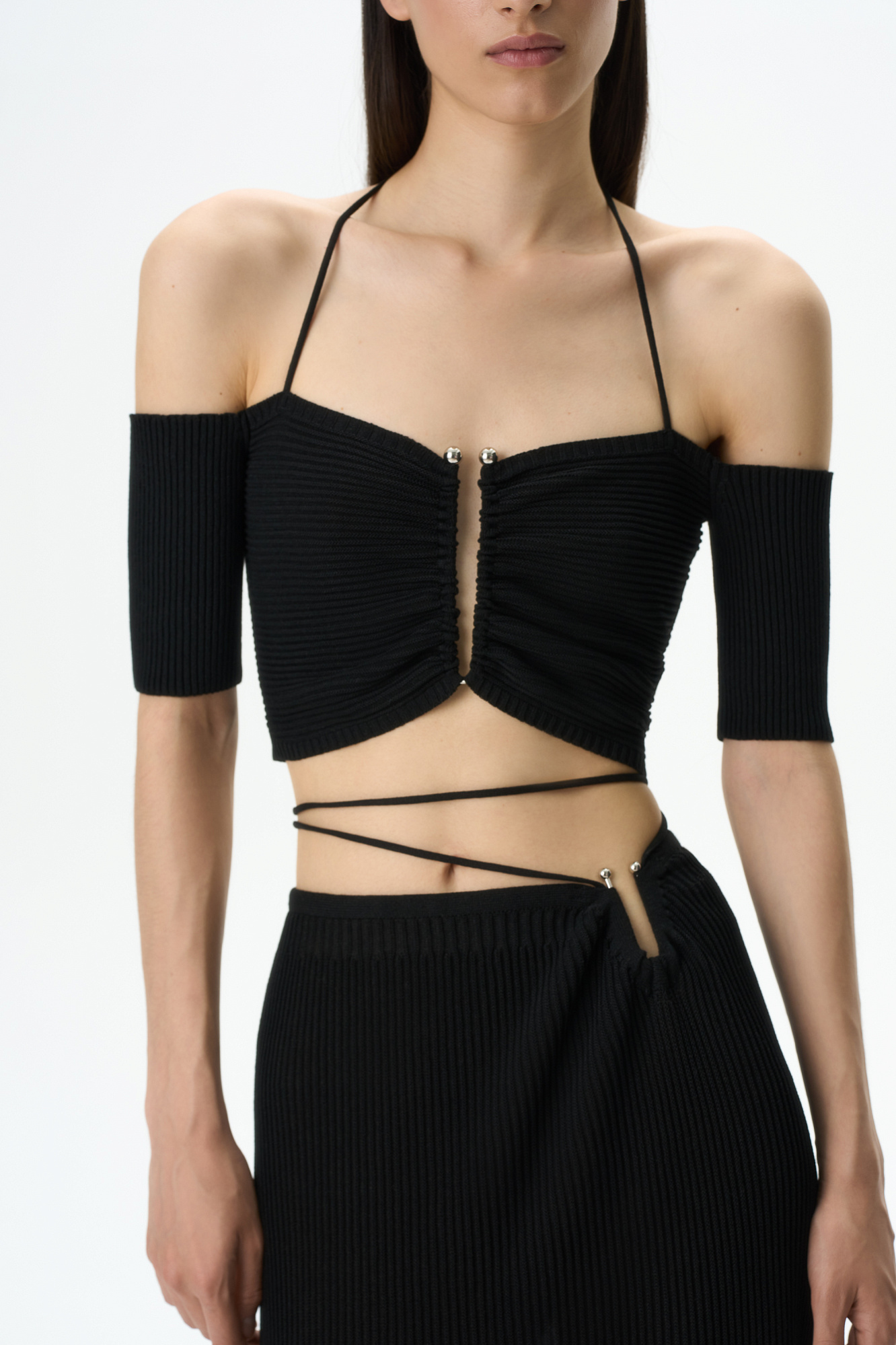 Трикотажный укороченный топ, декорированный металлической перемычкой на груди. Модель с открытыми плечами, короткими рукавами и тонкими бретелями, завязывающимися на шее.