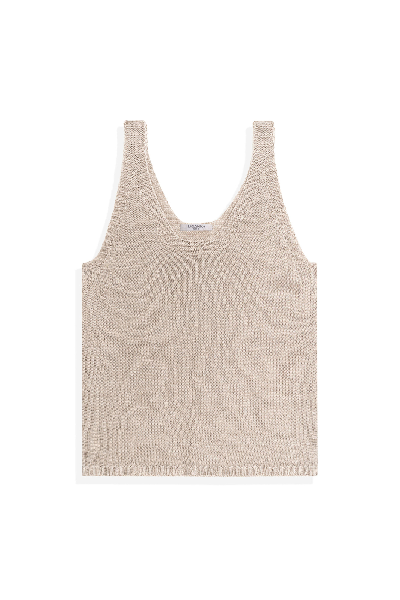 Трикотажный топ из 100% льна. Модель прямого кроя, на широких бретелях, с глубокой проймой и U-образным вырезом горловины. Края изделия выполнены в рубчик.
