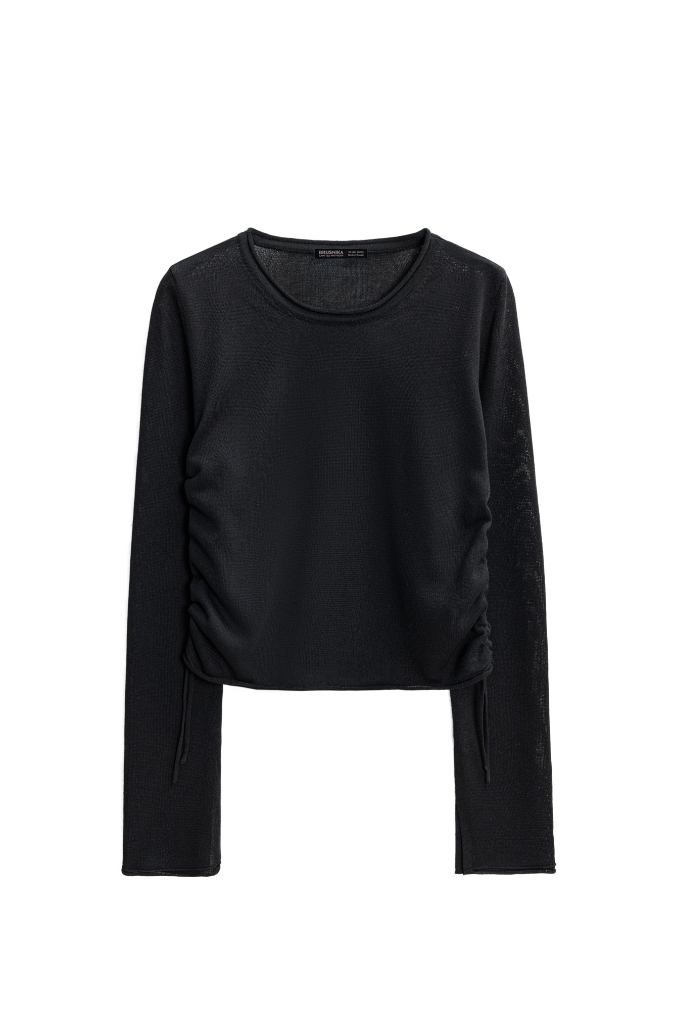 Трикотажный топ из вискозы. Модель прямого кроя, с длинным рукавом, небольшими разрезами на манжетах и круглым вырезом горловины. Кулиски по бокам изделия позволяют регулировать длину и создавать драпировку.