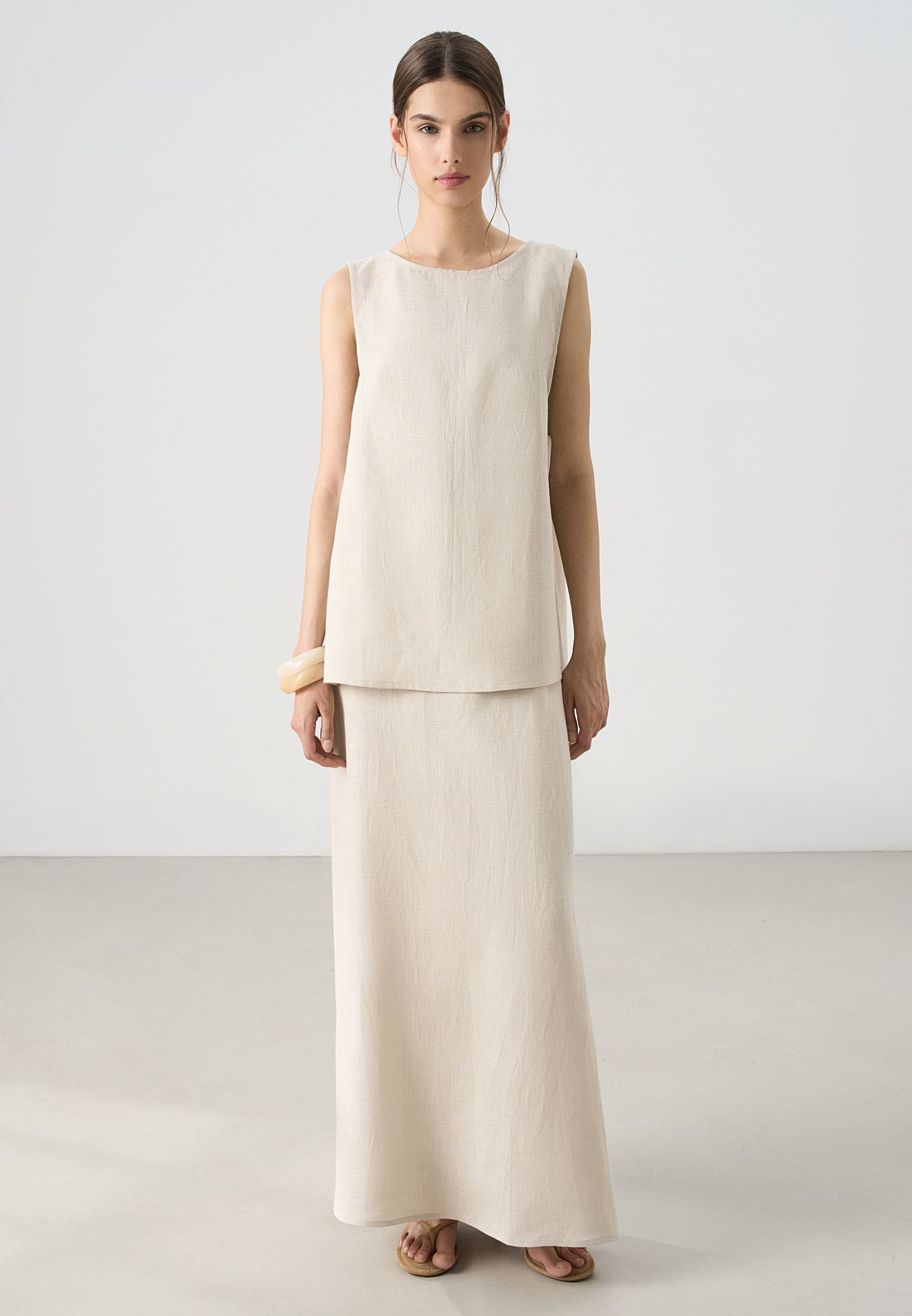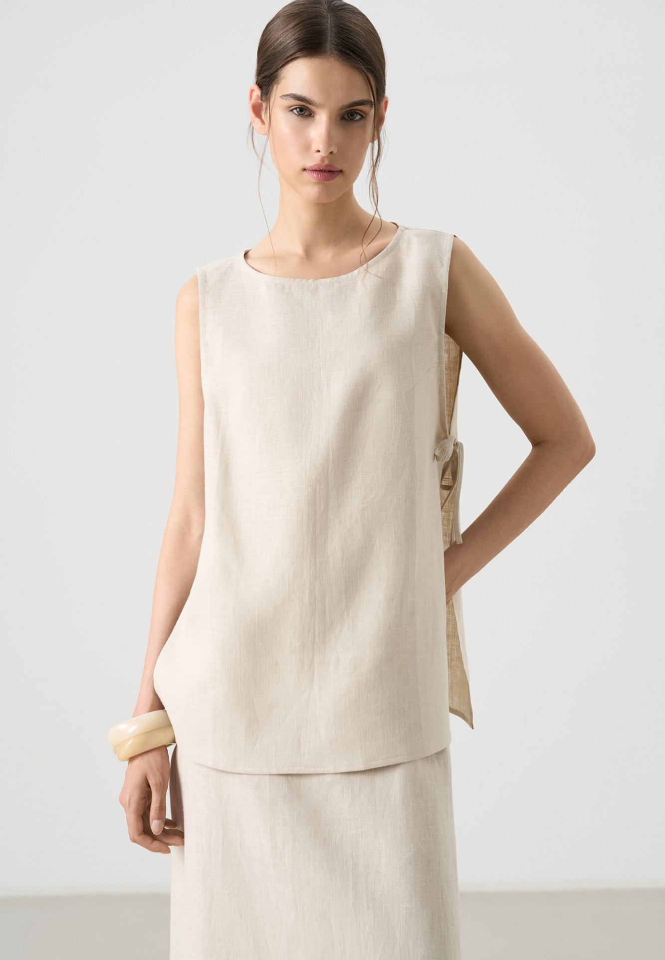 Топ из 100% льна. Модель свободного кроя, без рукавов, с круглым вырезом горловины. Изделие фиксируется завязками по бокам.