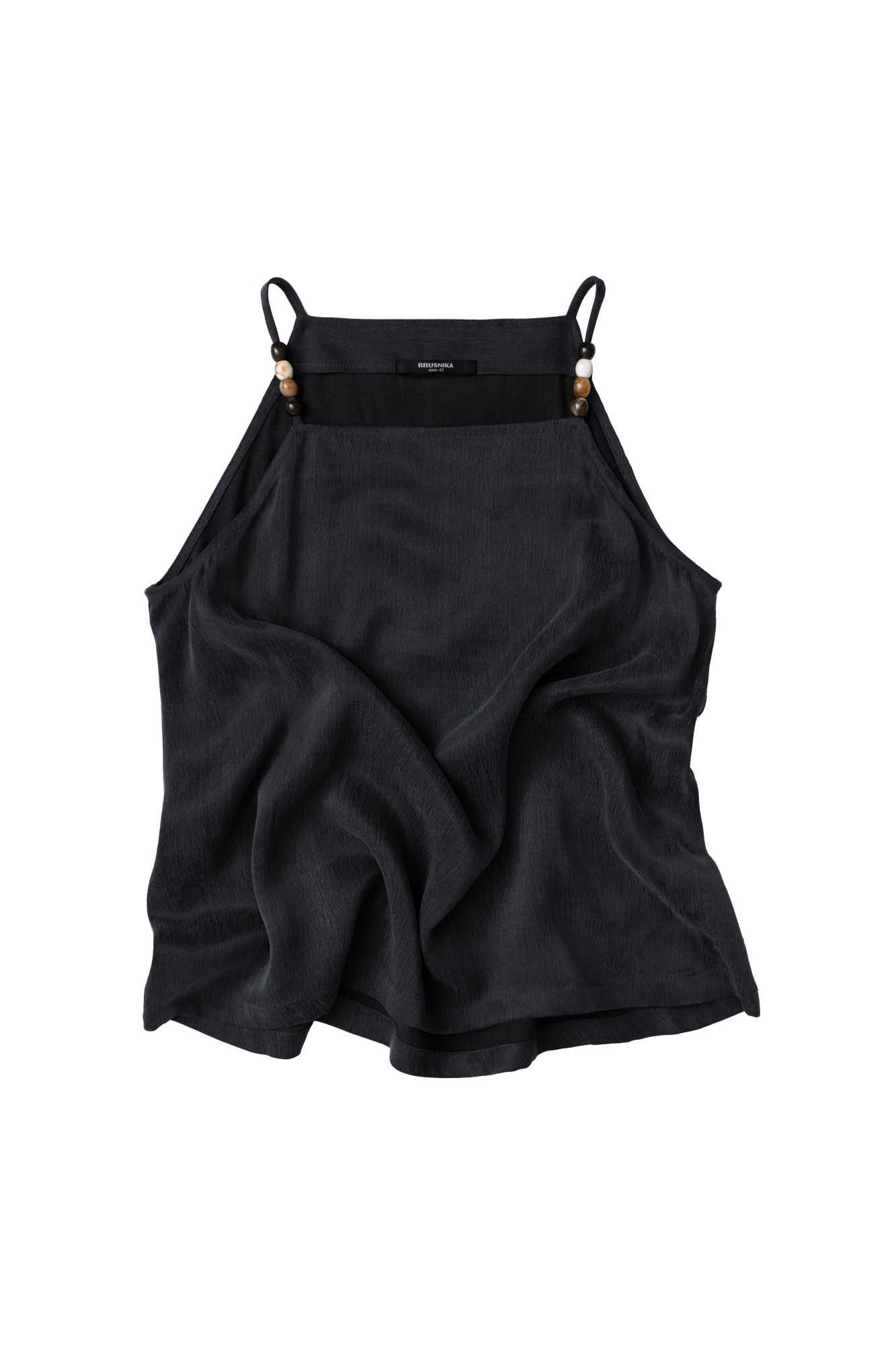 Топ из купры. Модель свободного силуэта, с прямым неглубоким вырезом, на тонких бретельках, декорированных бусинами.