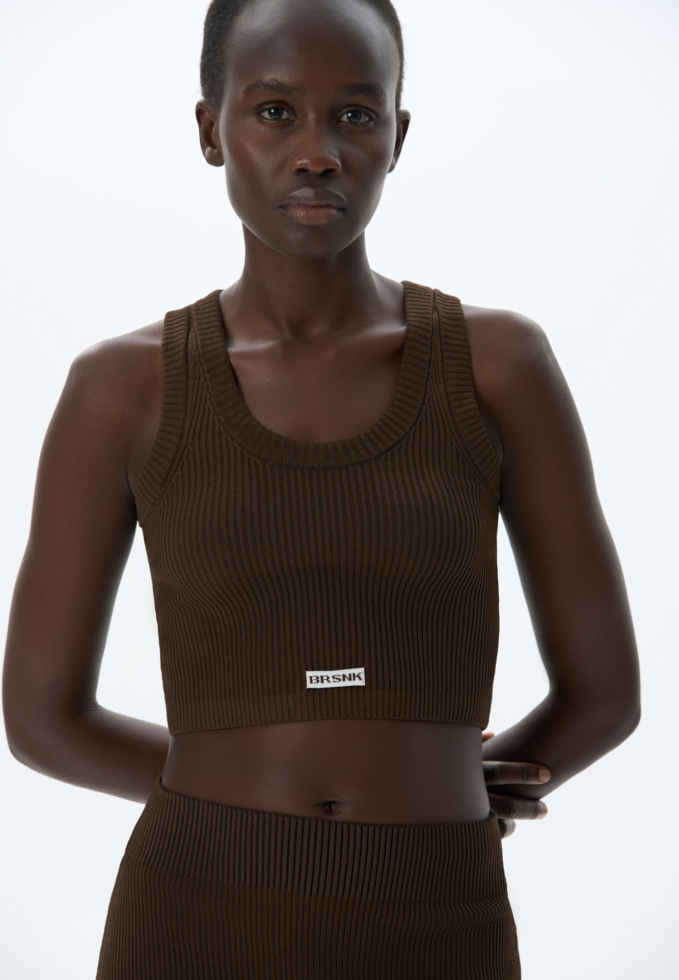 Трикотажный короткий топ из вискозы. Модель по фигуре, без рукавов и U-вырезом головины. Изделие выполнено в рубчик и декорирован брендированным жаккардом спереди.