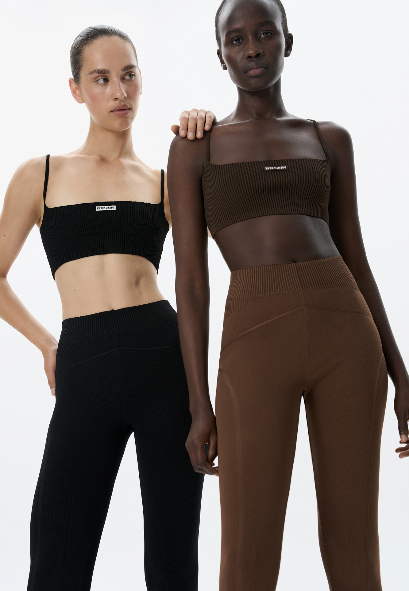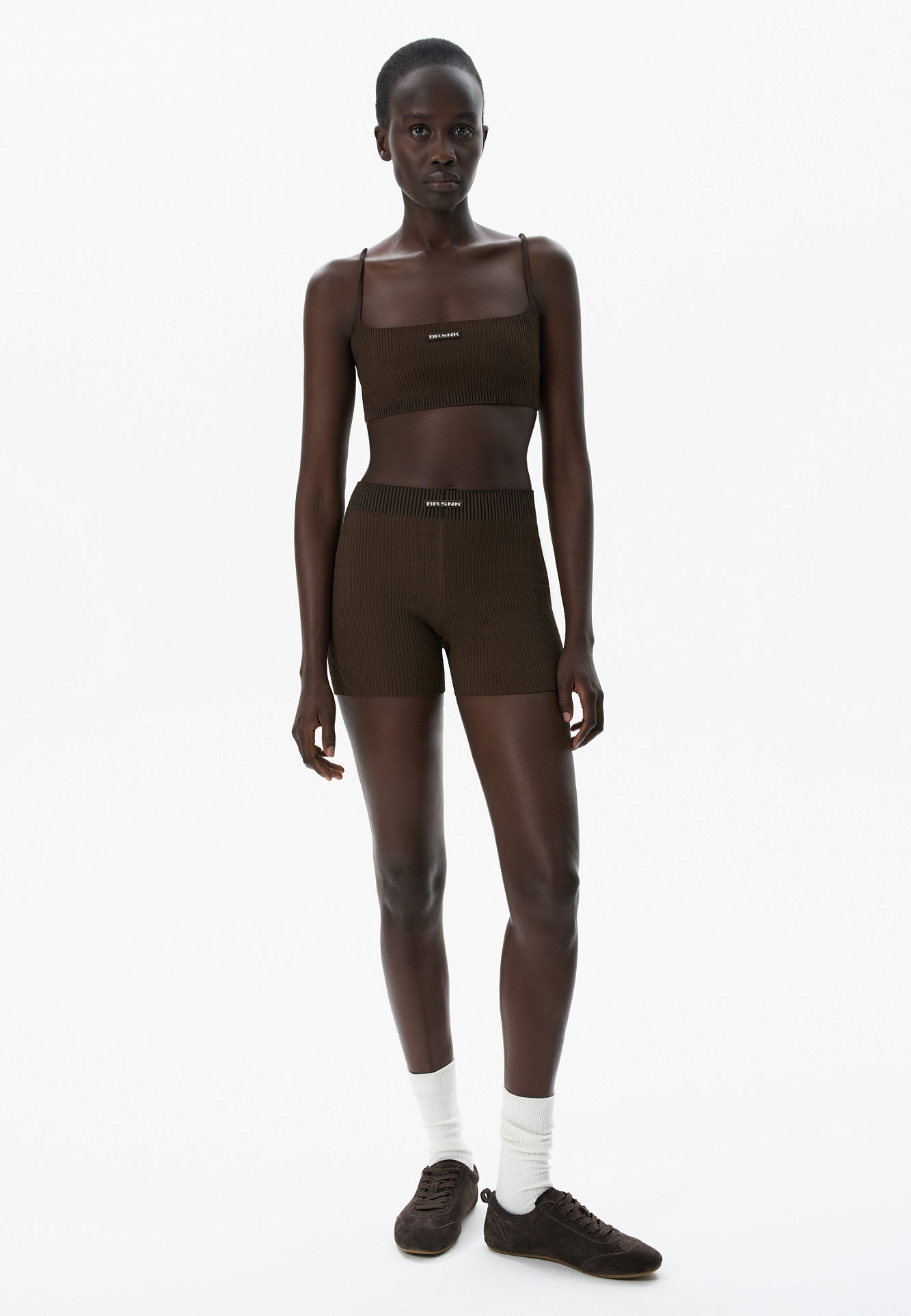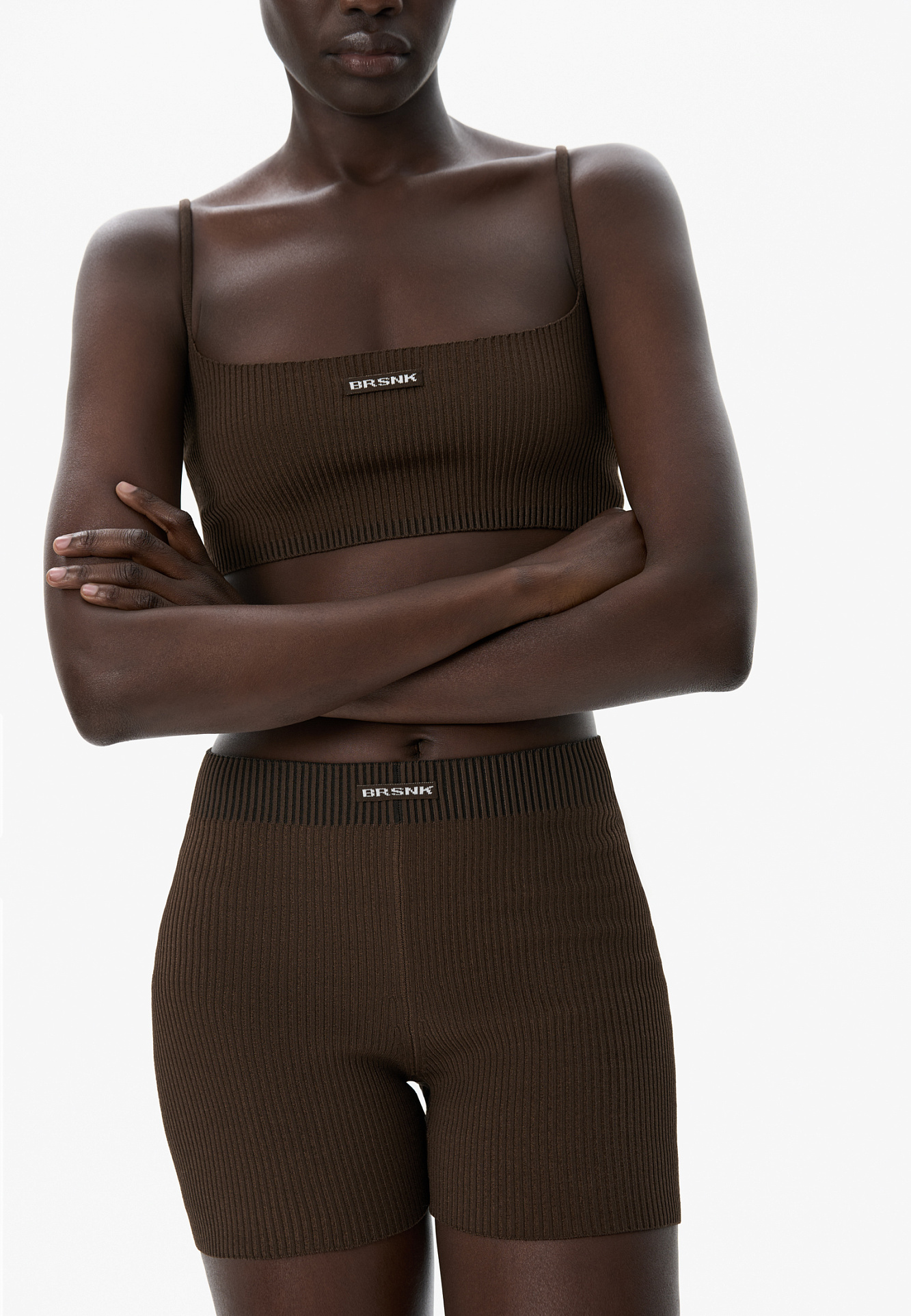 Трикотажный короткий топ из вискозы в спортивном стиле. Модель выполнена в рубчик на тонких бретельках. Брендированный жаккард на груди. Дополнить образ можно шортами в таком же стиле.