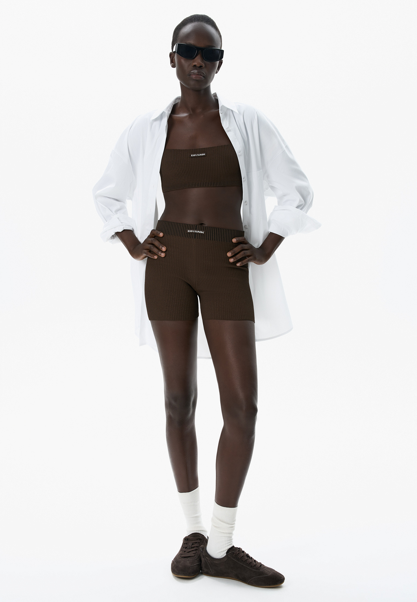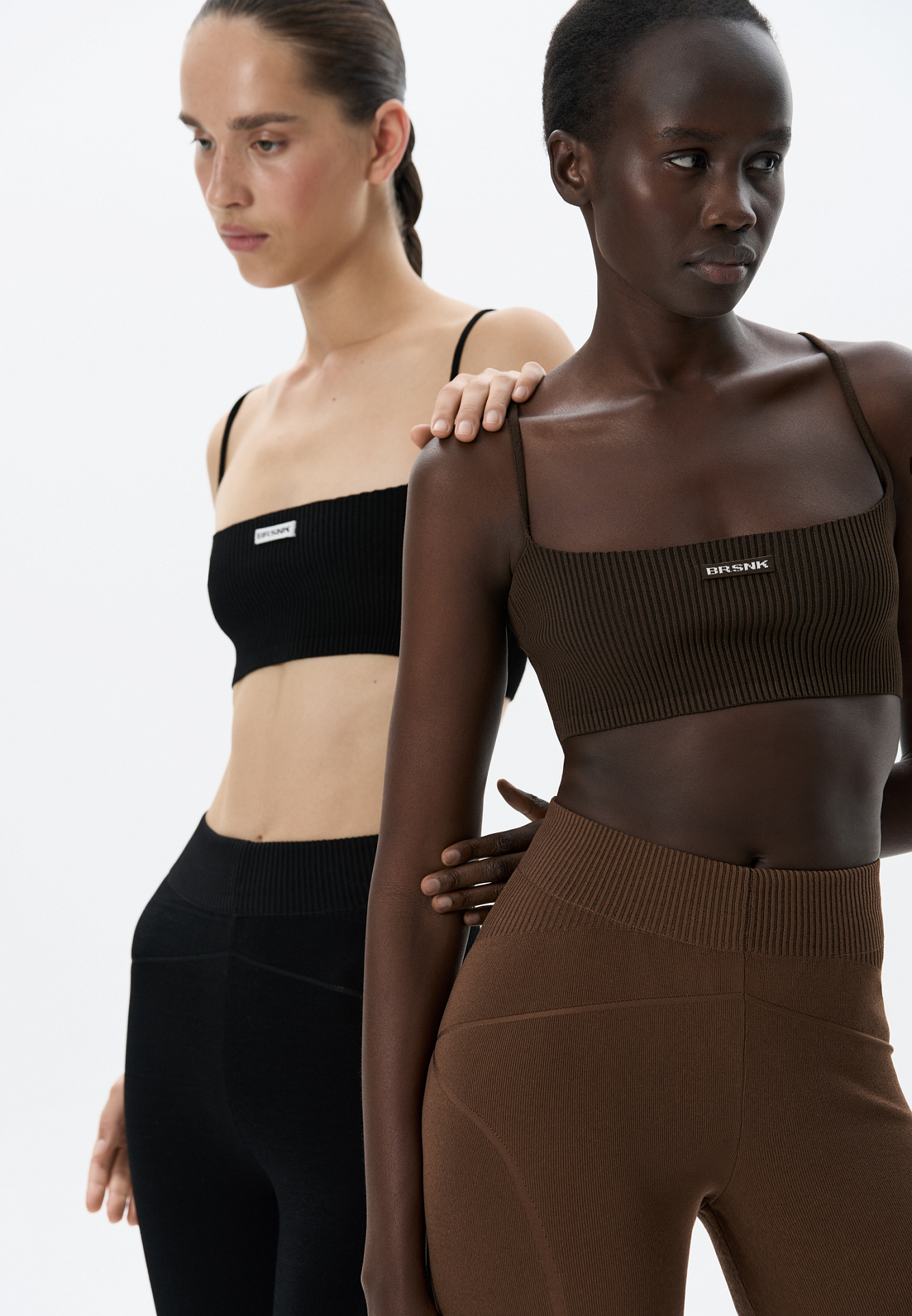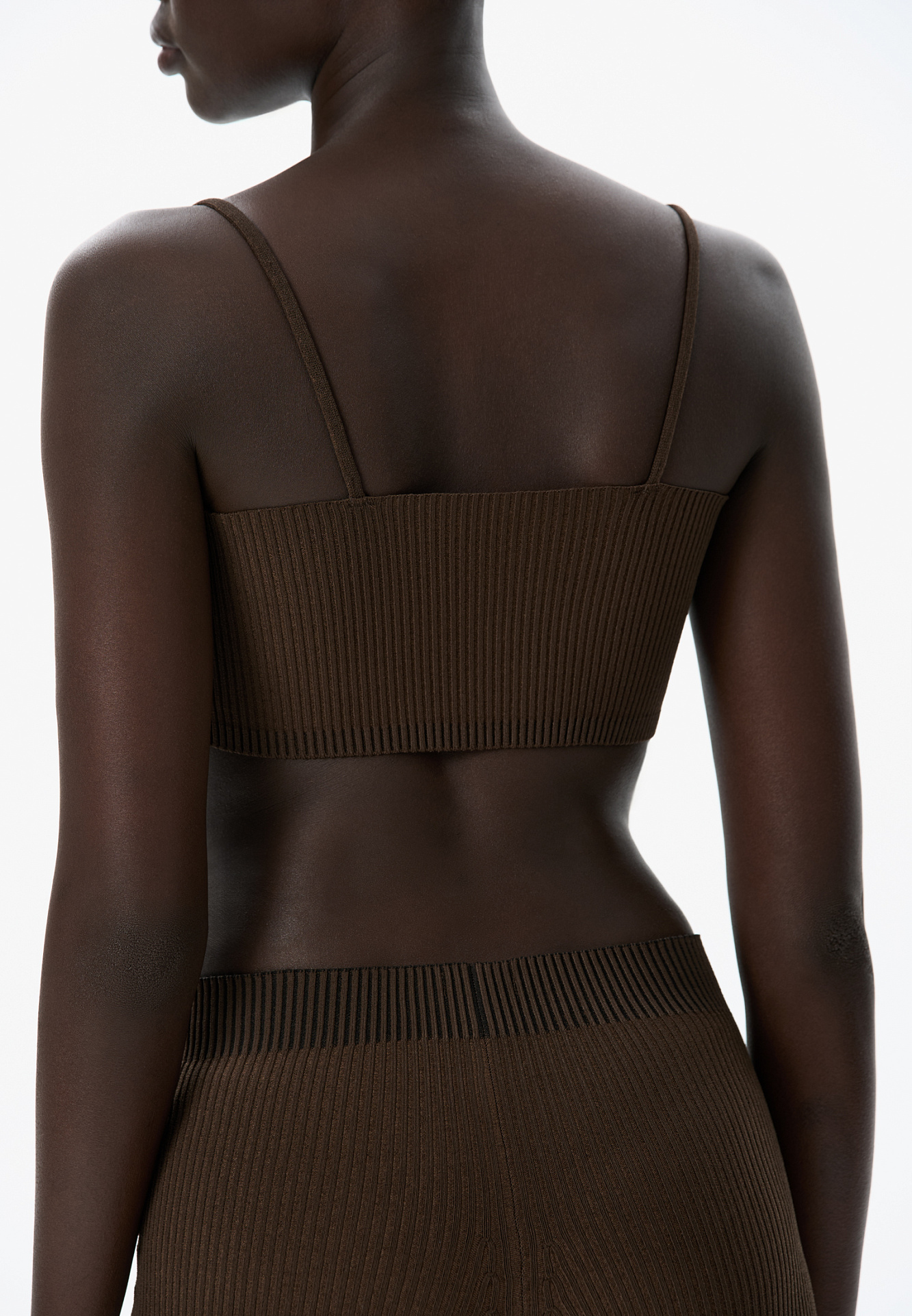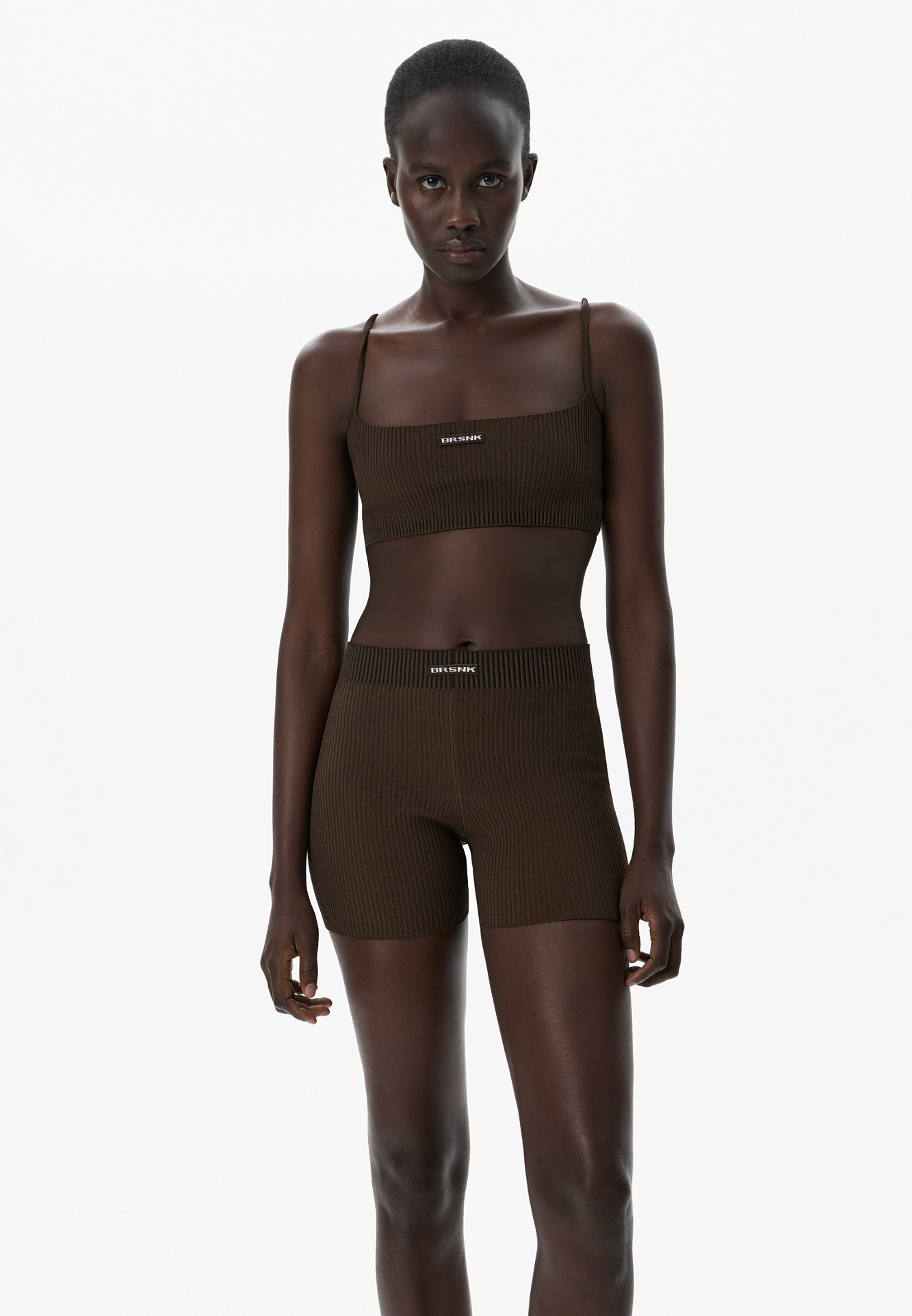 Трикотажный короткий топ из вискозы в спортивном стиле. Модель выполнена в рубчик на тонких бретельках. Брендированный жаккард на груди. Дополнить образ можно шортами в таком же стиле.