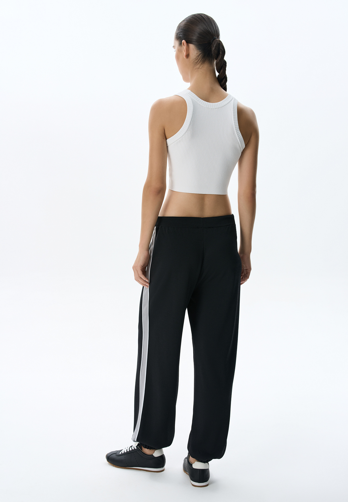 Трикотажный короткий топ из вискозы. Модель по фигуре, без рукавов и U-вырезом головины. Изделие выполнено в рубчик и декорирован брендированным жаккардом спереди.