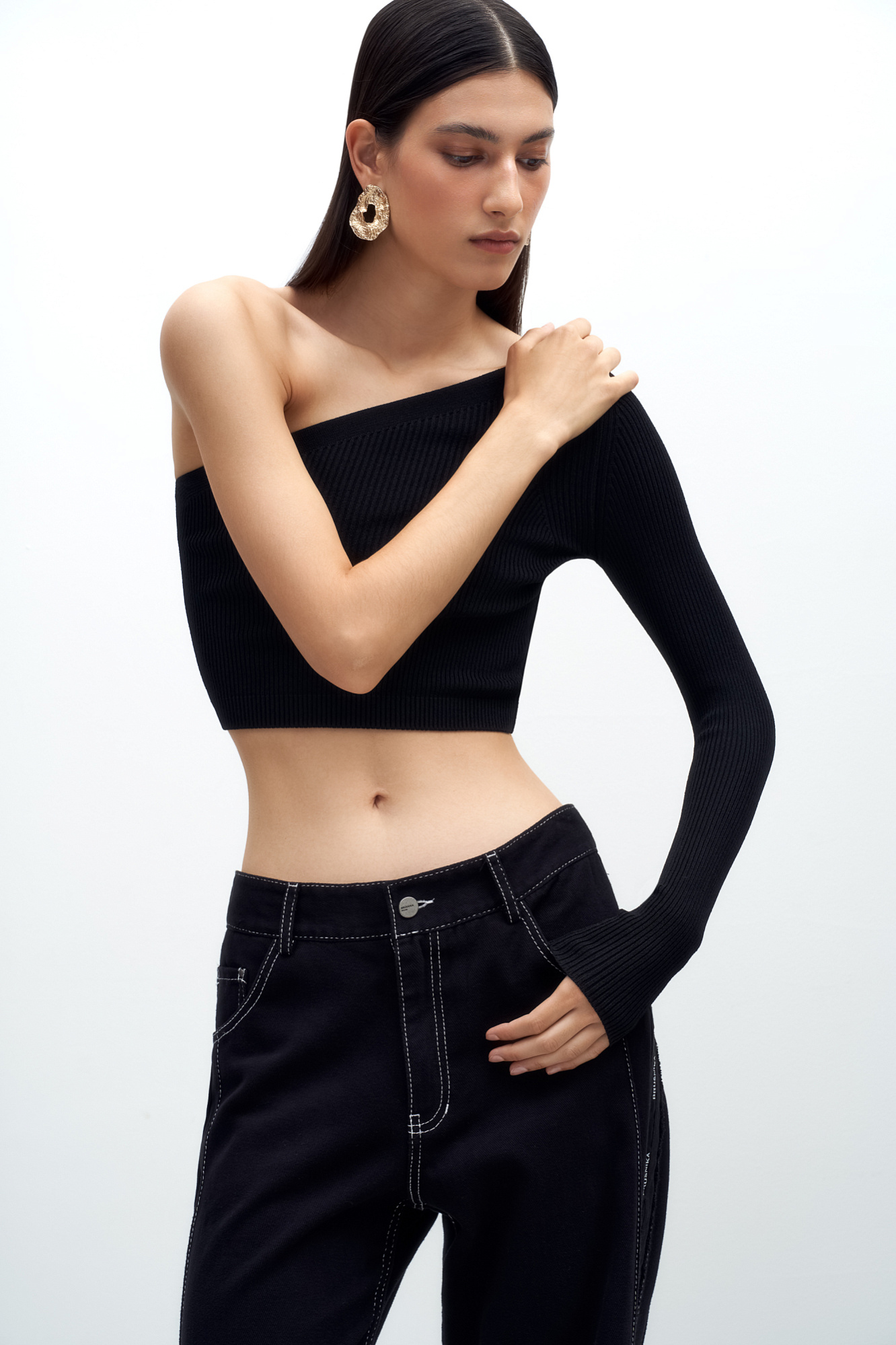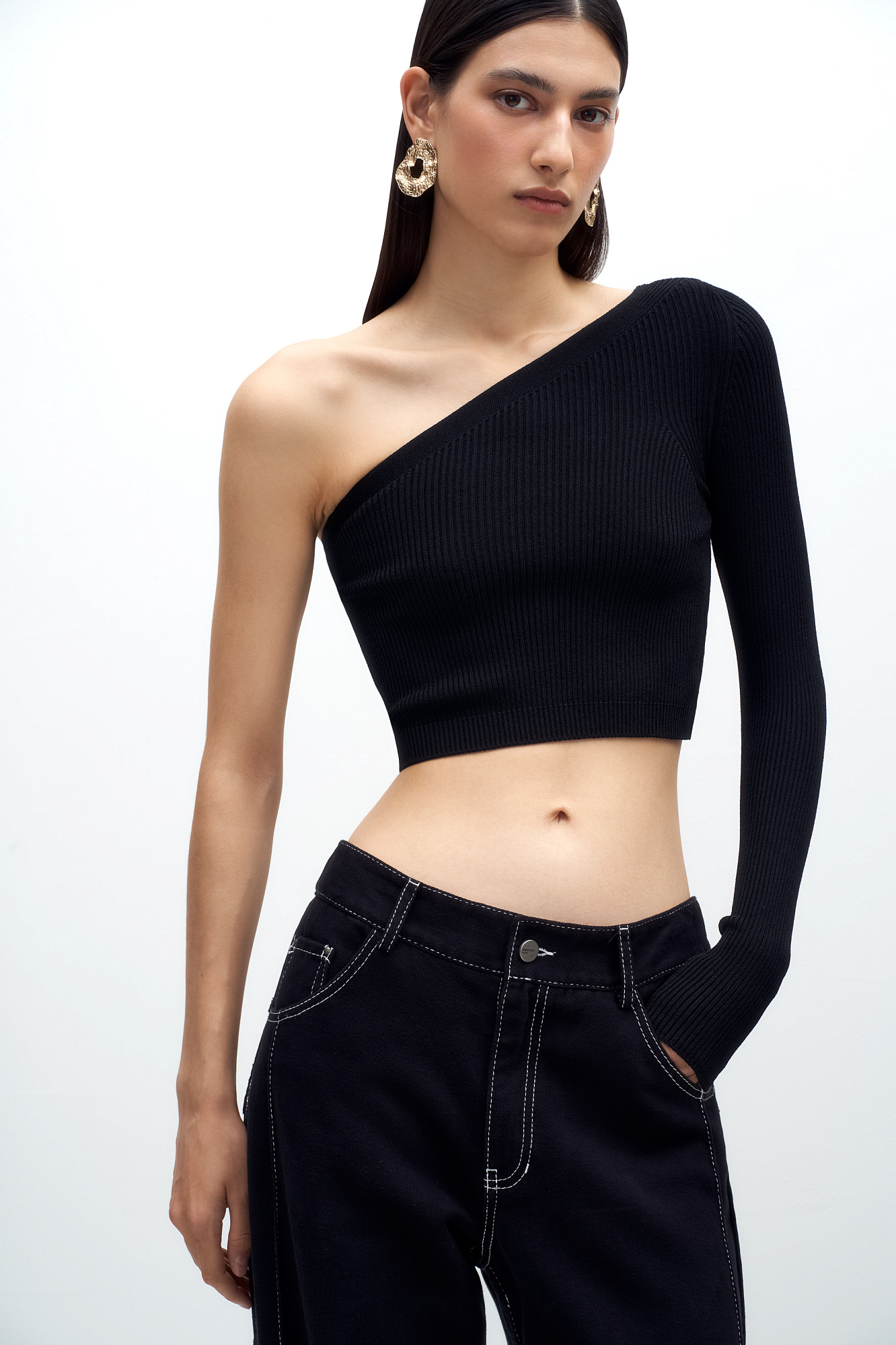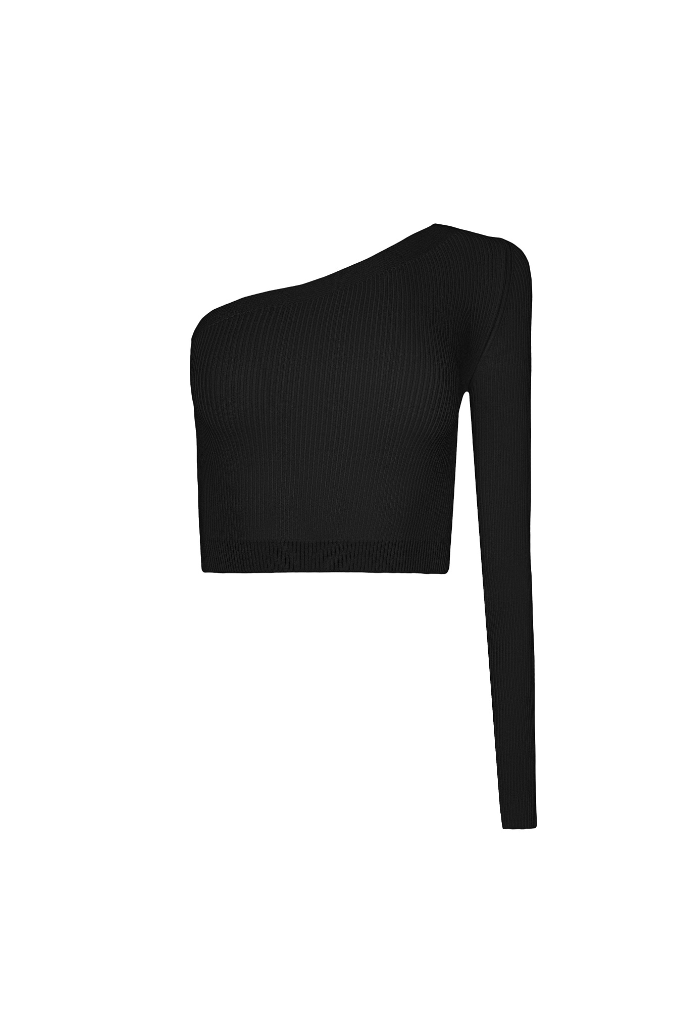 Трикотажный топ в рубчик из вискозы. Модель приталенного силуэта с одним рукавом.