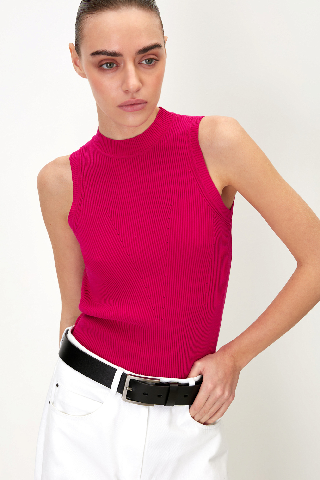 Облегающий топ в мелкий рубчик прекрасно сочетается с жакетами и кардиганами, но и в одиночном варианте выступает отличным спутником офисного образа.