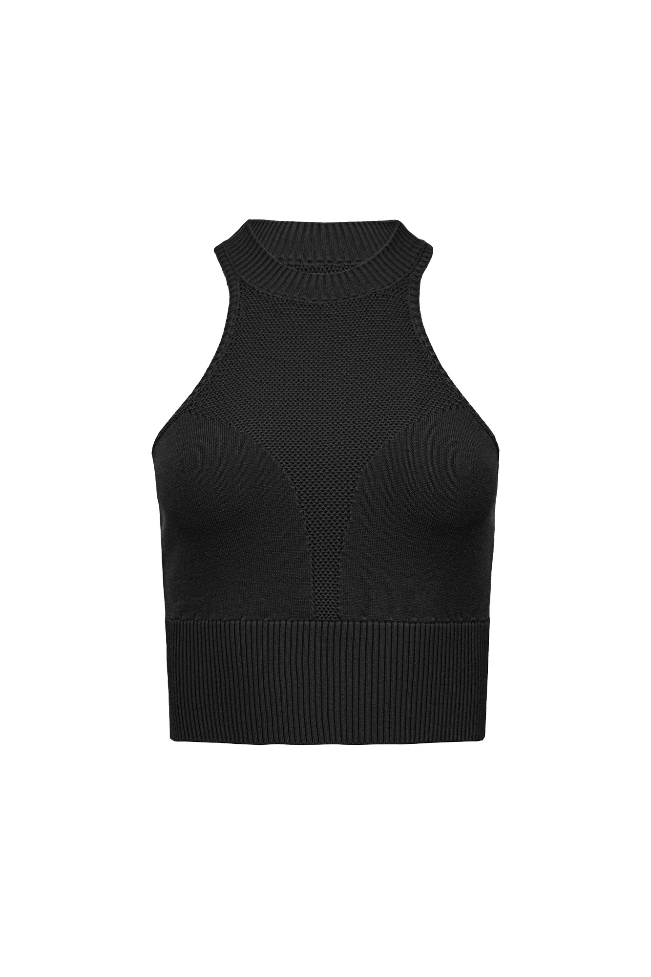 Спортивный топ из вискозы с акцентом на зону декольте. Модель приталенного силуэта, с глубокой проймой и широким поясом в рубчик.