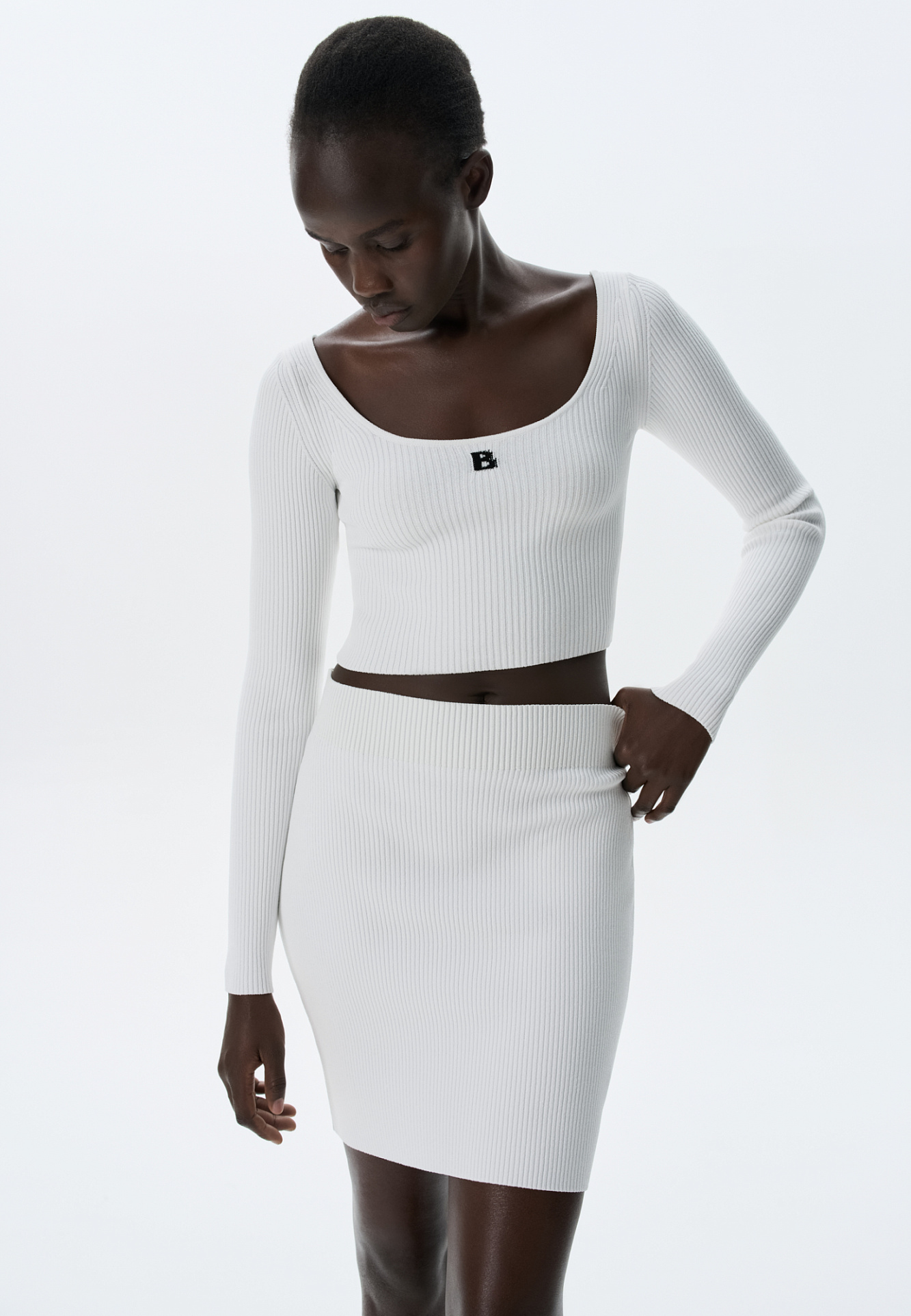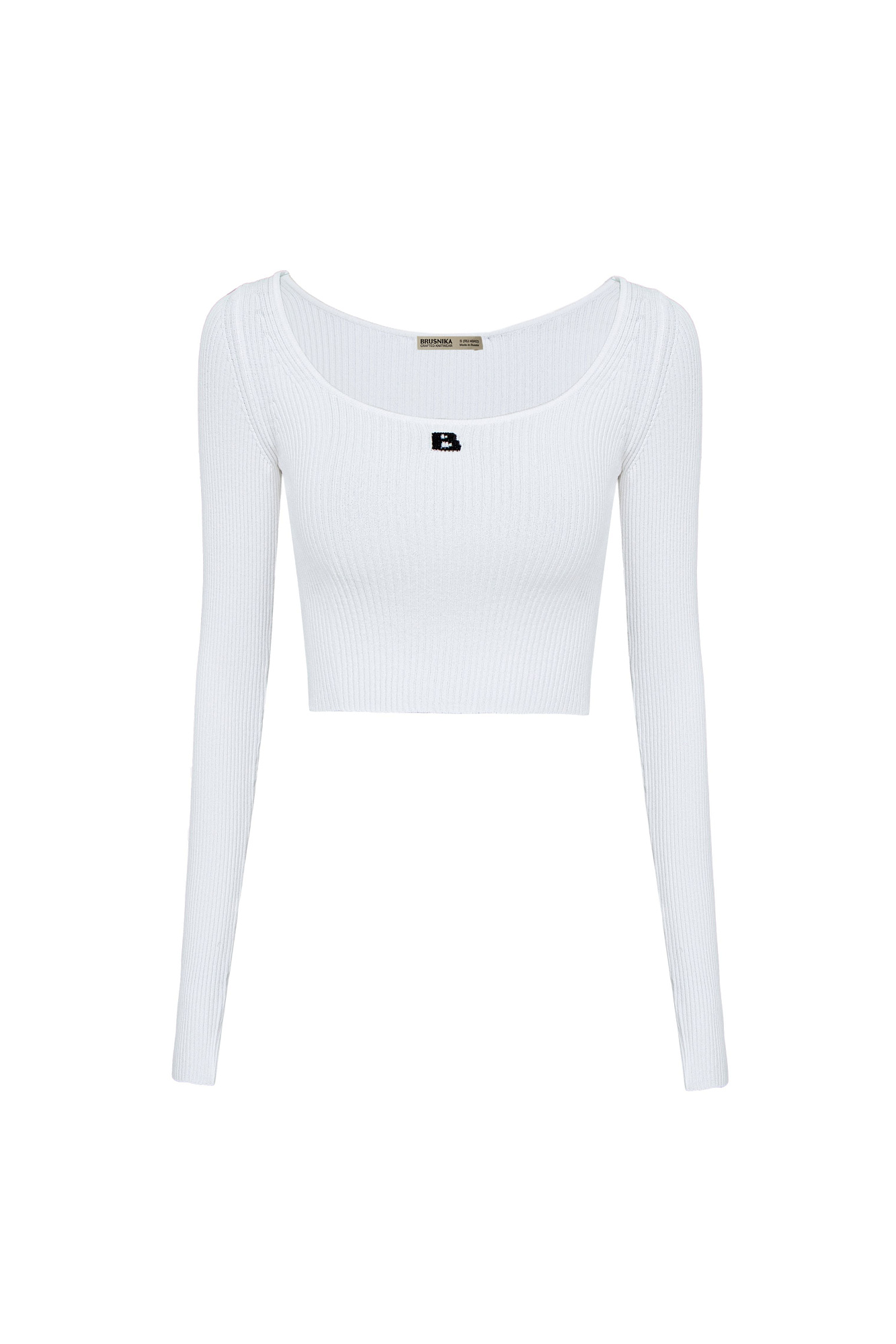 Укороченный топ из вискозы в спортивном стиле с длинными рукавами и круглым вырезом. Дополнить образ можно лосинами или юбкой.