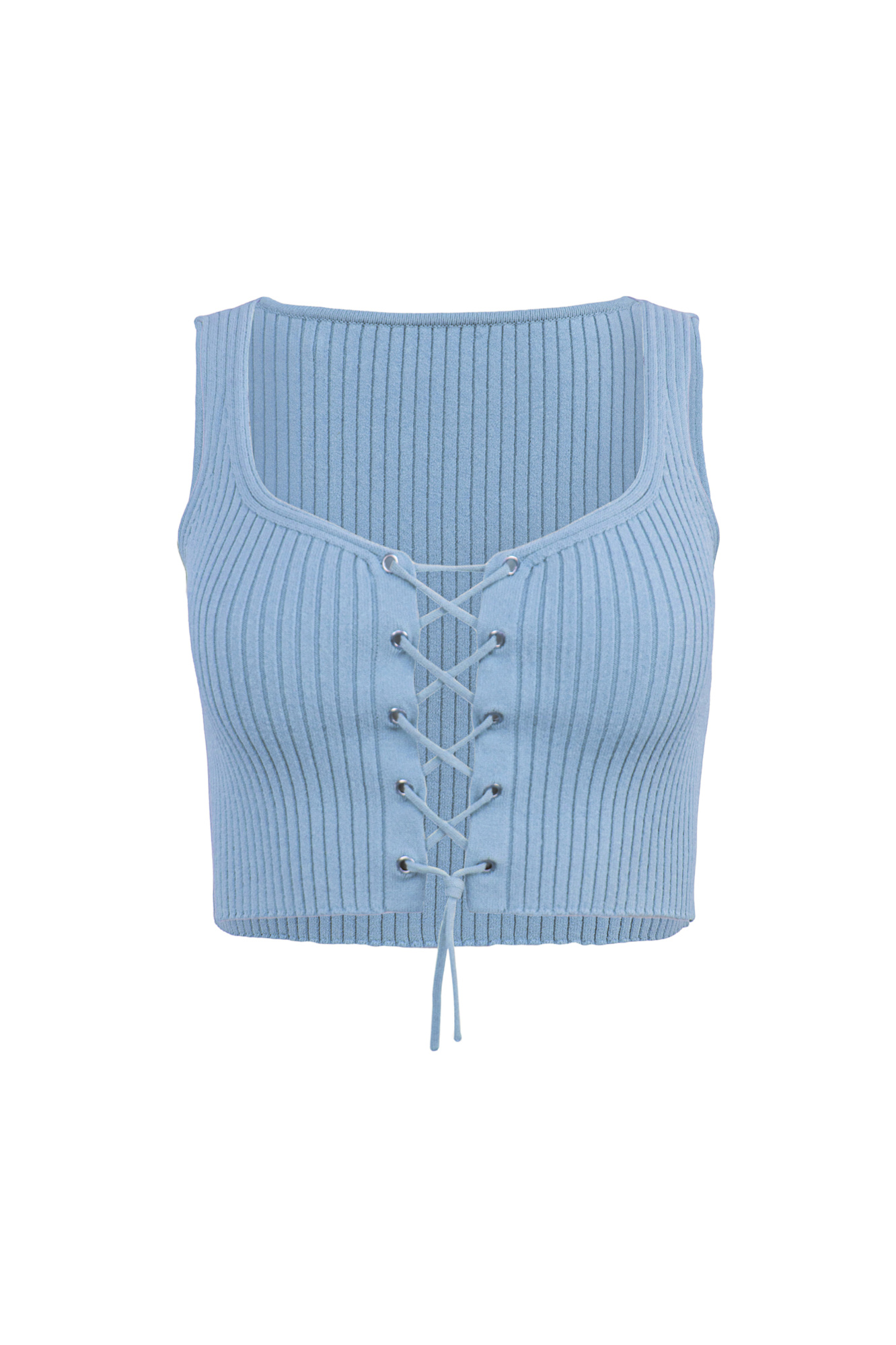 Короткий трикотажный топ из вискозы. Модель приталенного силуэта, без рукавов, на широких бретельках, с люверсами и шнуровкой на груди. Дополнить образ можно юбкой в таком же стиле.
