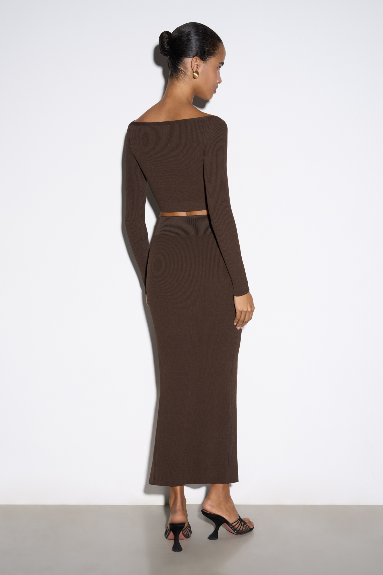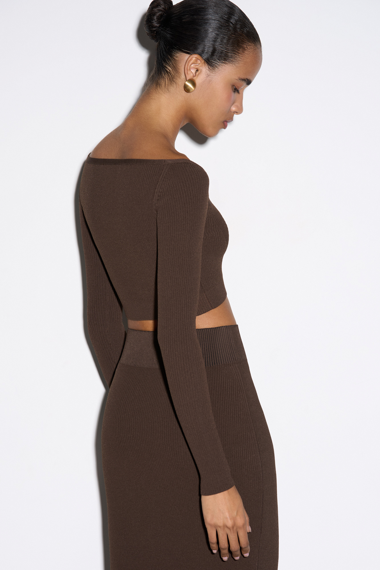 Трикотажный укороченный топ из вискозы в рубчик. Модель по фигуре с глубоким декольте и с декоративным элементом на лифе. Отлично сочетается с трикотажной юбкой из этой же коллекции.