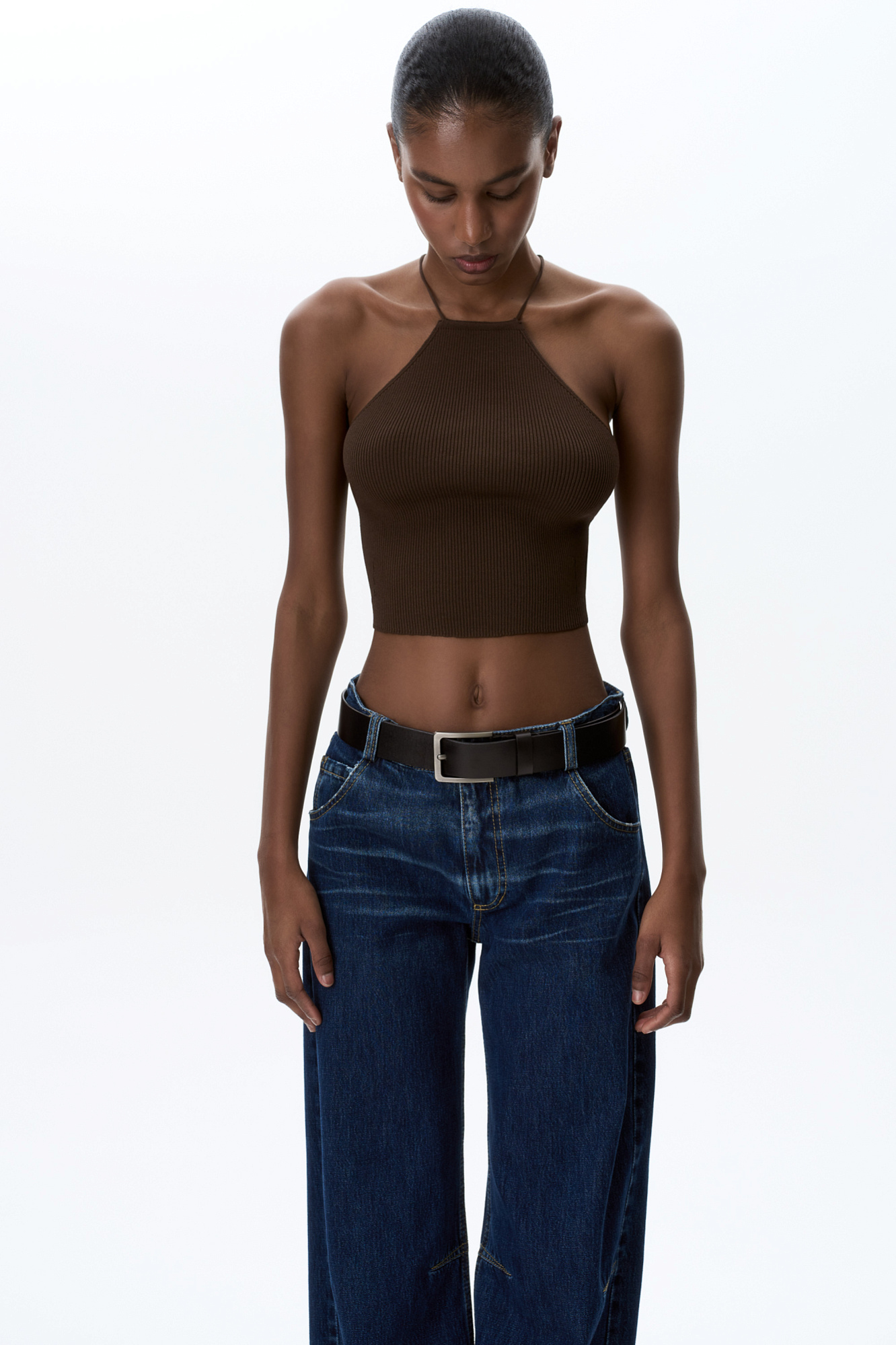 Трикотажный топ в рубчик из вискозы. Открытая спина на кулиске и тонких бретелях.