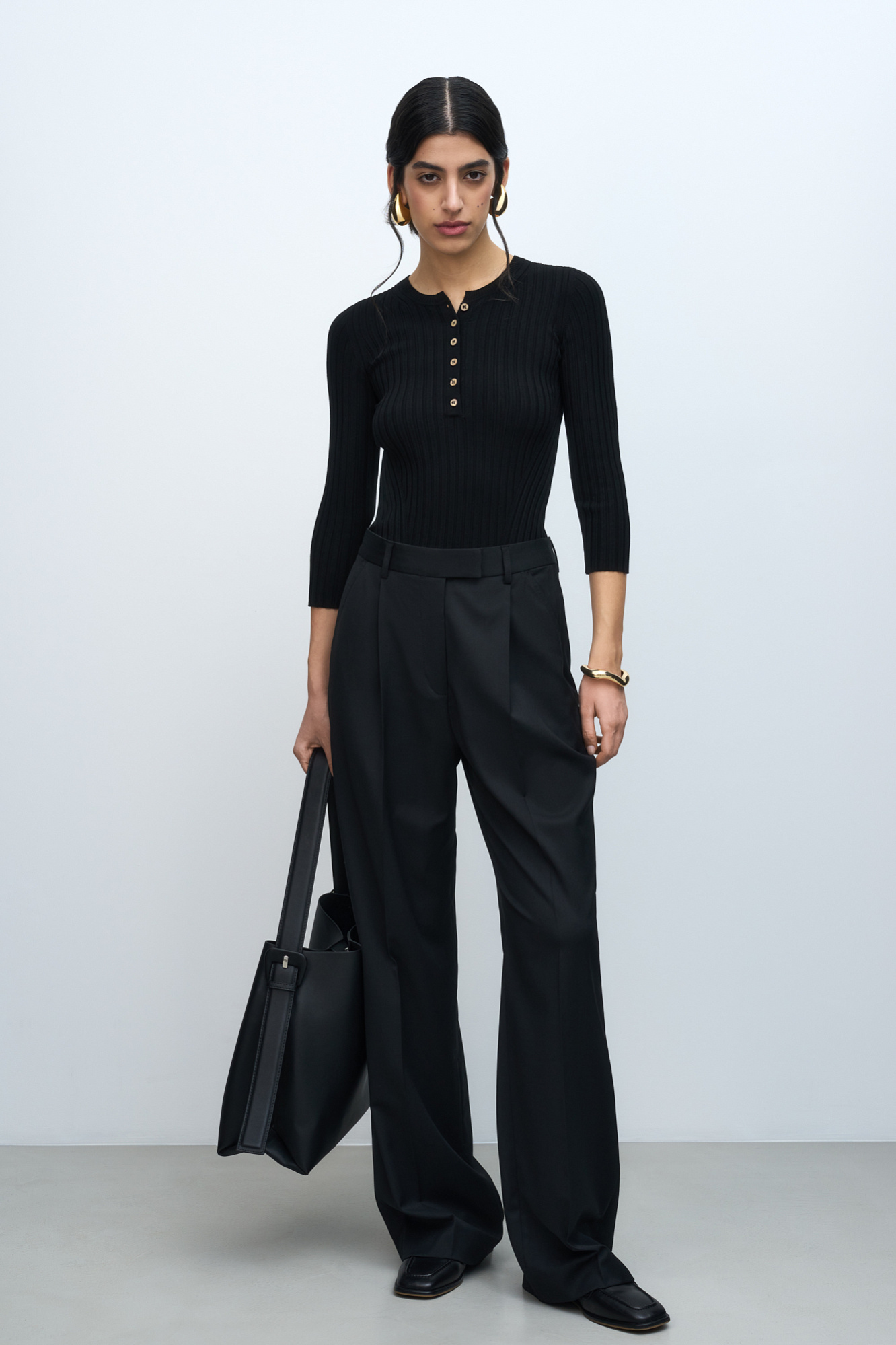 Трикотажный топ из вискозы в широкий рубчик. Модель с рукавами 3/4 и вырезом горловины с планкой на пуговицах, создающим V-образный вырез.