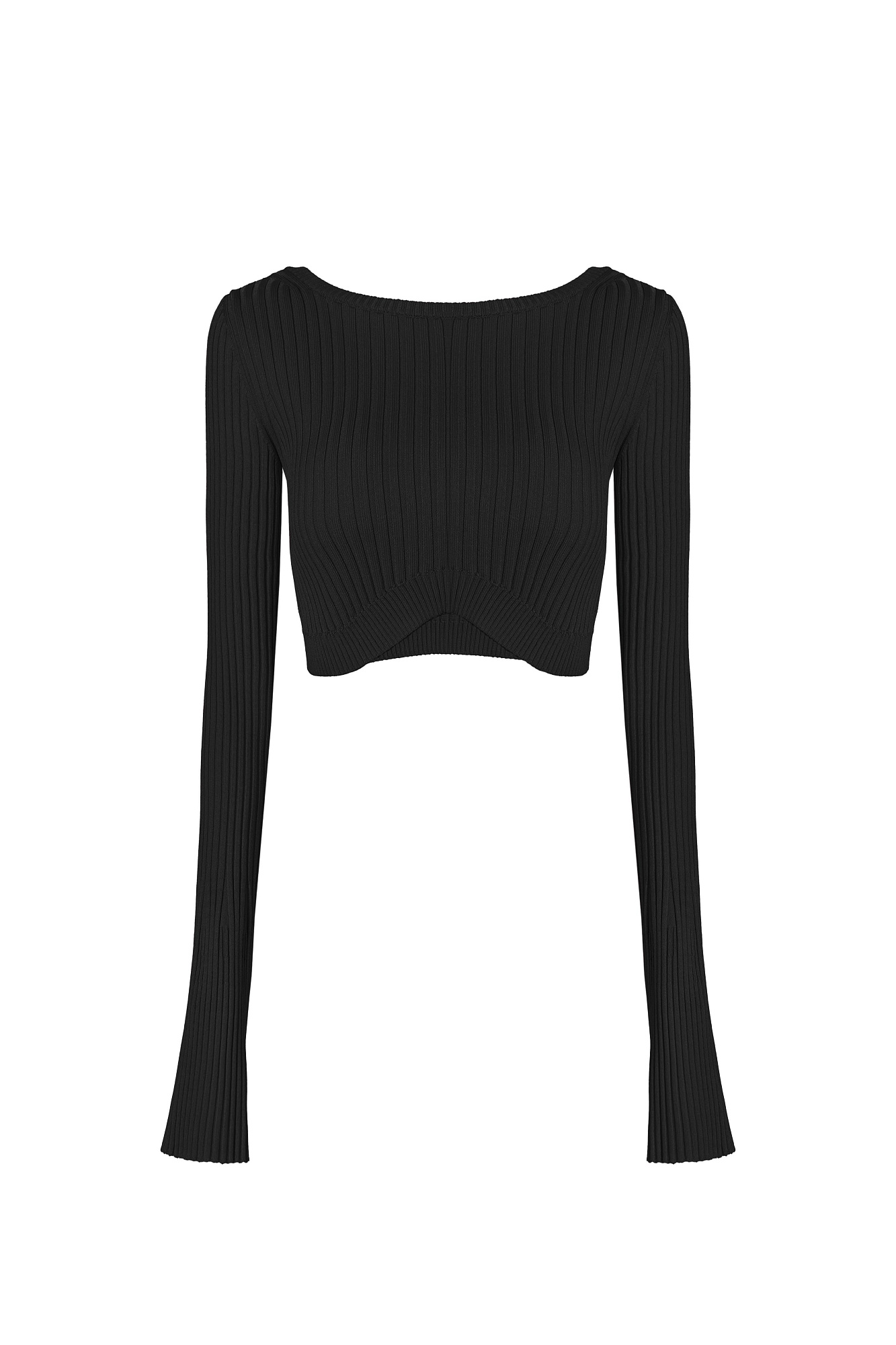 Укороченный трикотажный топ из вискозы в рубчик. Обтягивающая модель с открытой спиной. Дополнить образ можно юбкой в таком же стиле.