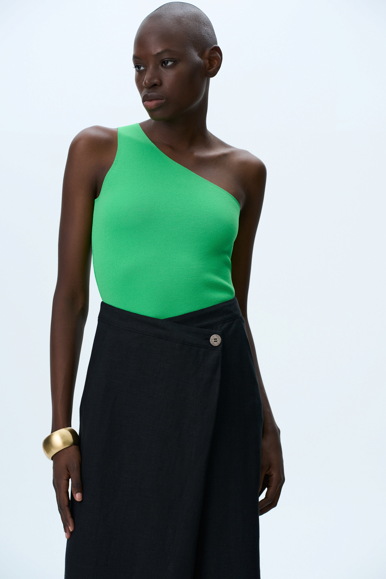 Трикотажный топ из вискозы. Модель облегающего силуэта, с лямкой на одно плечо.
