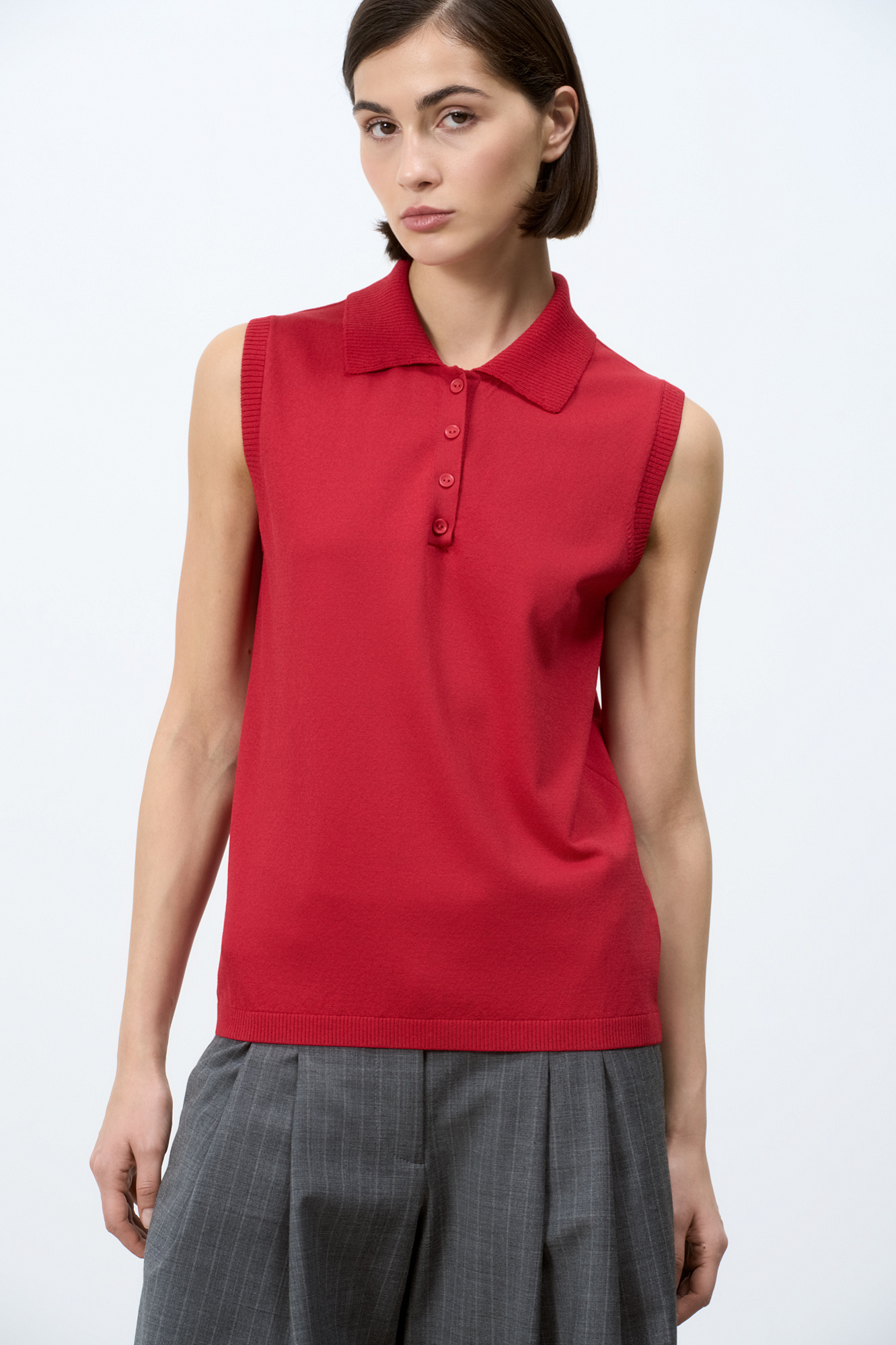Трикотажный топ с воротником-поло. Модель приталенного силуэта, застежка на пуговицы. Края изделия в рубчик.