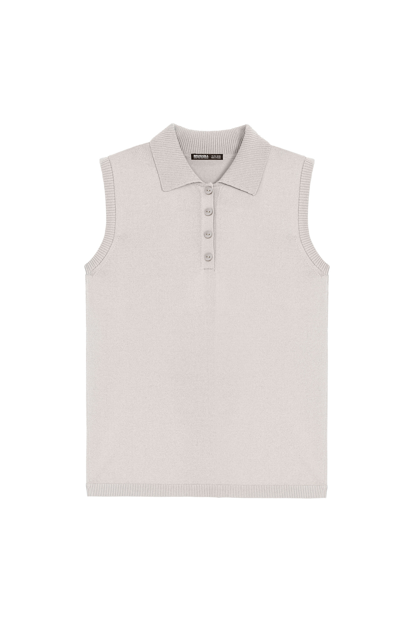 Трикотажный топ с воротником-поло. Модель приталенного силуэта, застежка на пуговицы. Края изделия в рубчик.