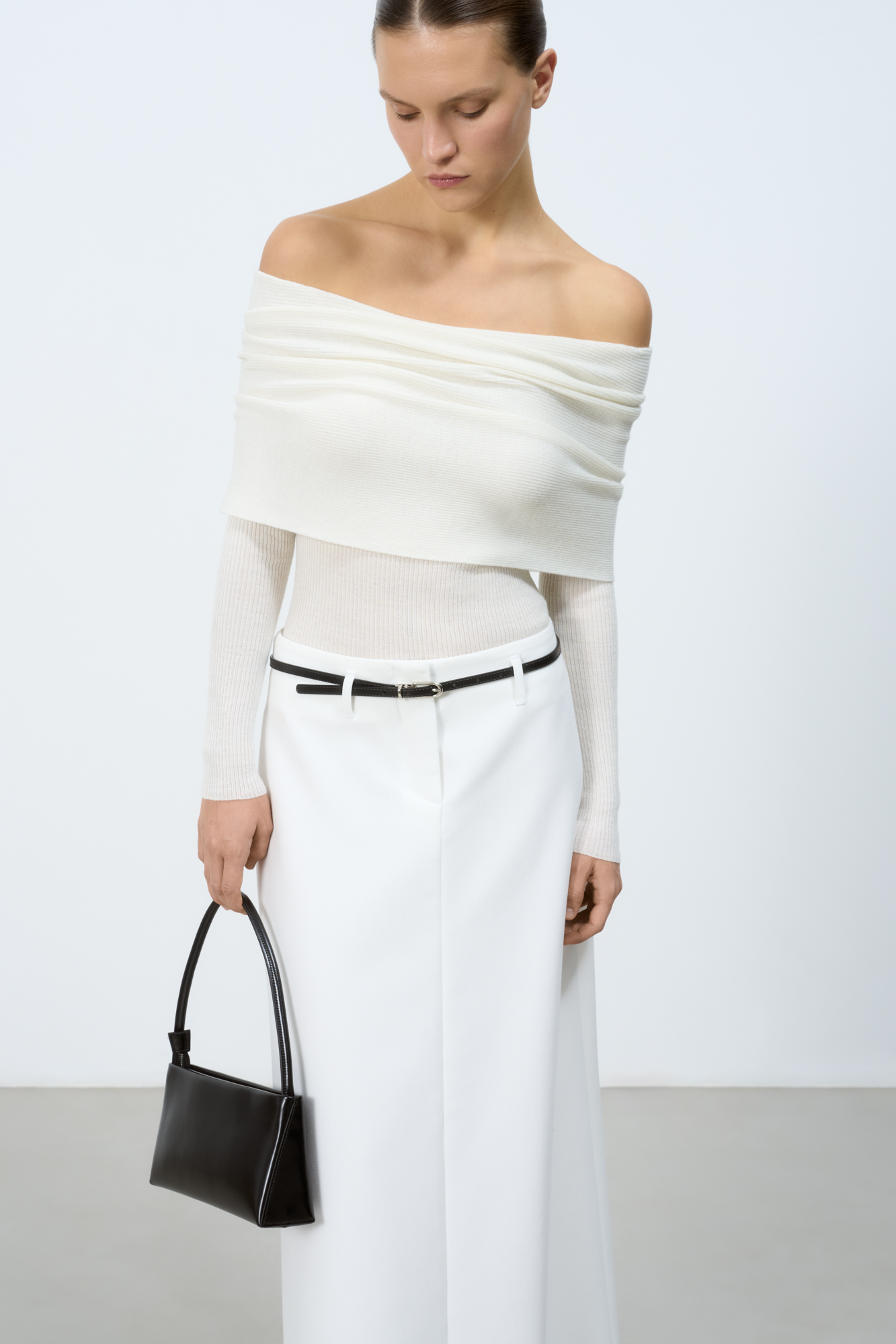 Трикотажный шерстяной топ с длинным рукавом и открытой линией плеч.