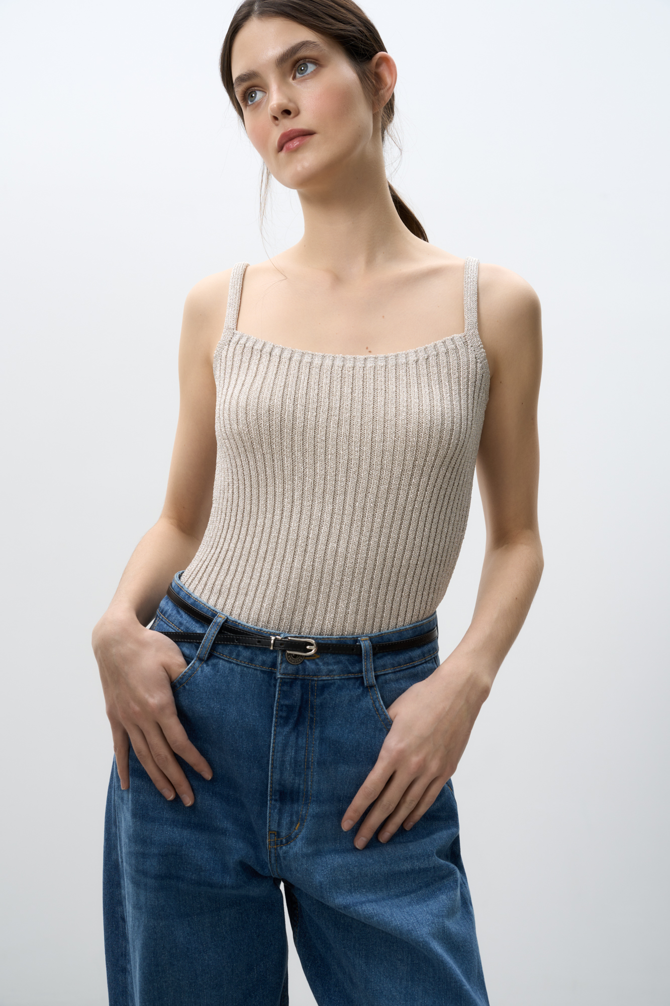 Трикотажный топ из поливискозы с добавлением люрекса. Модель приталенного силуэта на тонких лямках.