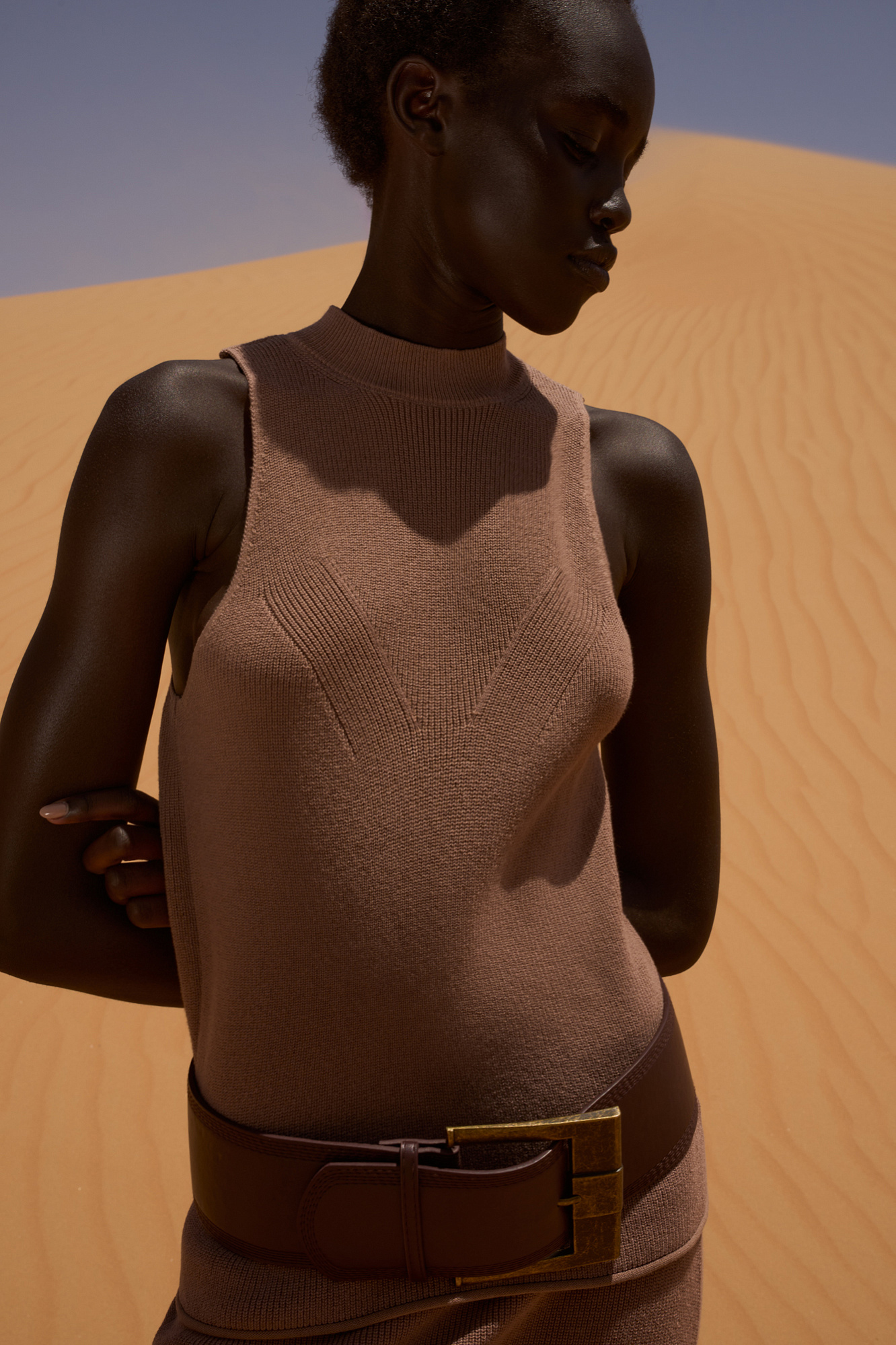 Трикотажный топ из хлопка с добавлением вискозы. Модель с высоким воротником-стойкой и глубокой проймой. Воротник изделия выполнен в мелкий рубчик.