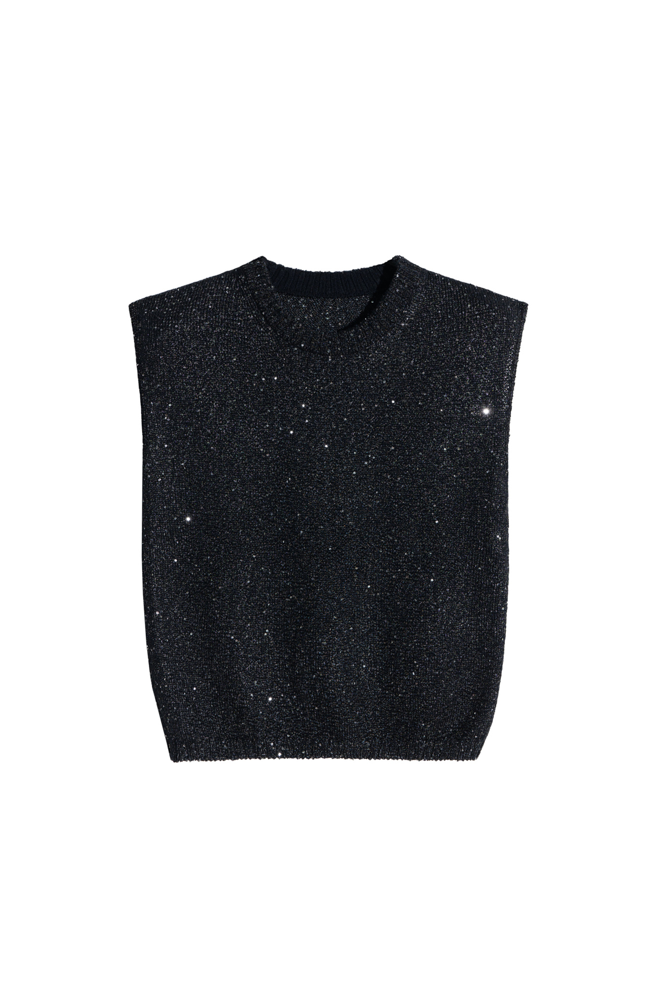 Трикотажный топ из хлопка с пайетками. Модель прямого кроя без рукавов, с круглым вырезом горловины. Края изделия выполнены в рубчик.