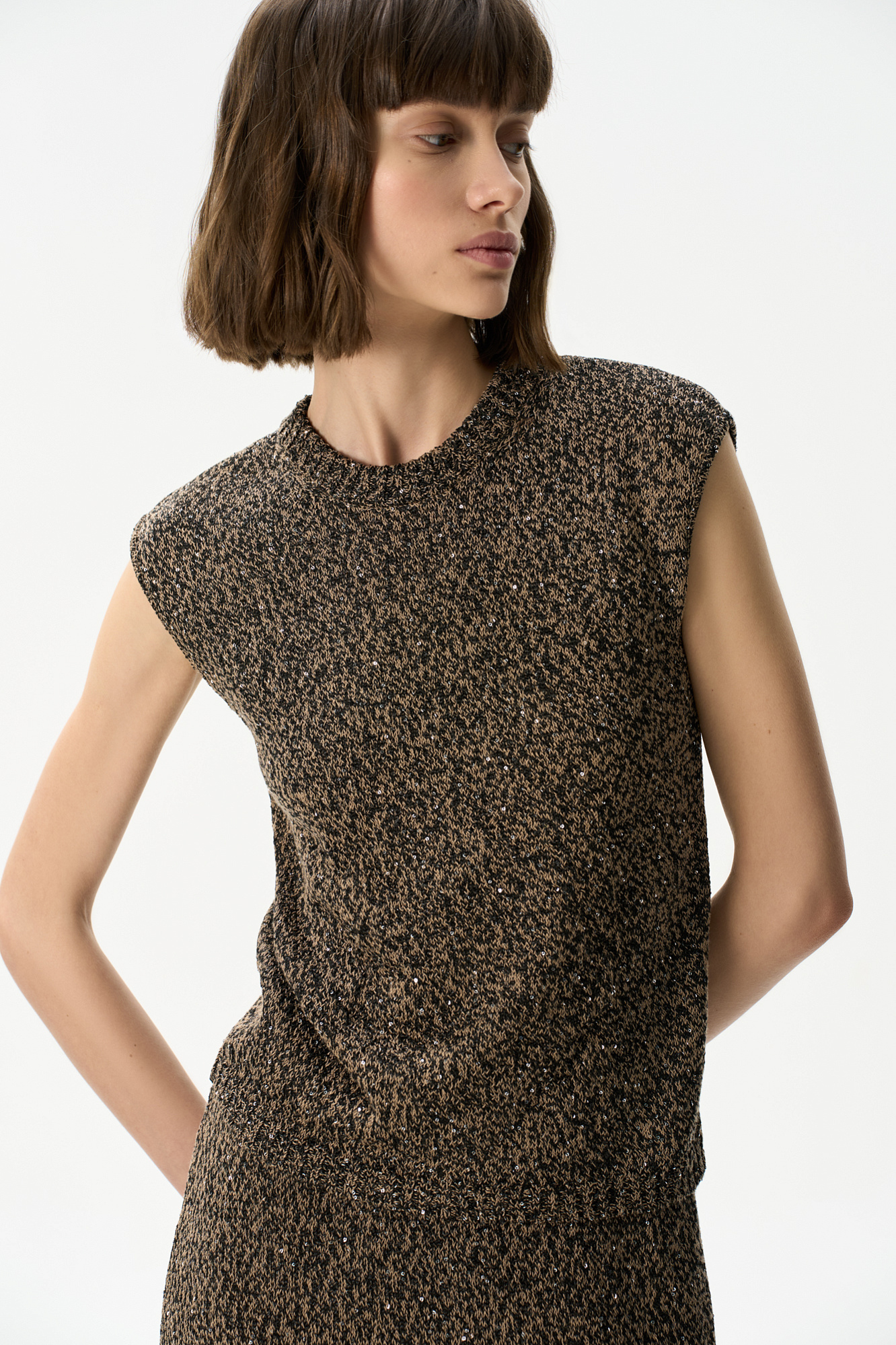 Трикотажный топ из хлопка с пайетками. Модель прямого кроя без рукавов, с круглым вырезом горловины. Края изделия выполнены в рубчик.