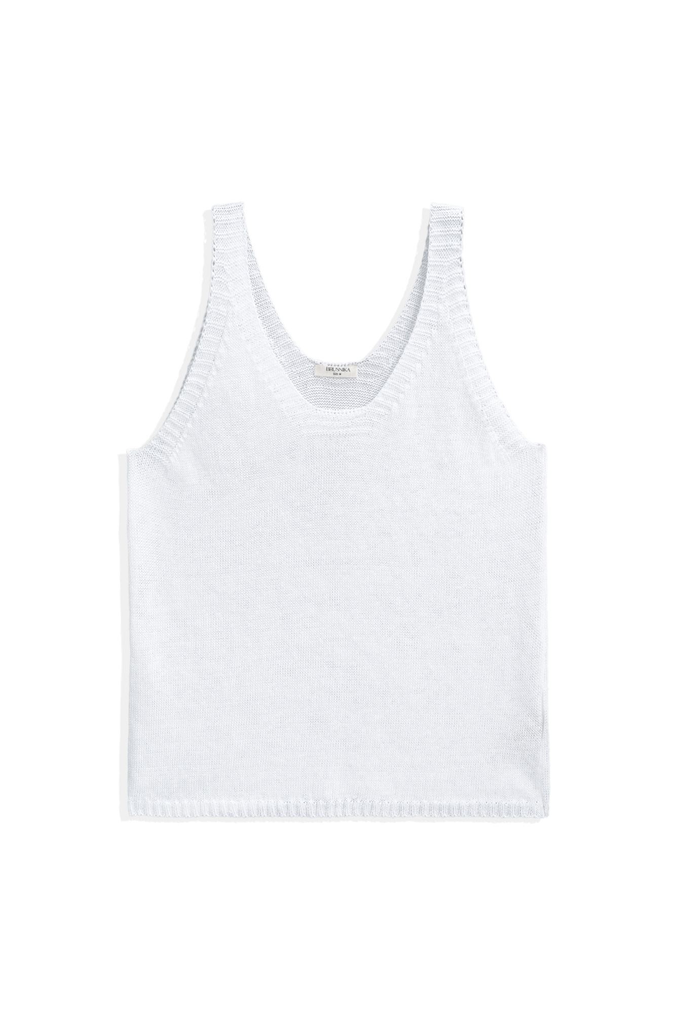 Трикотажный топ из 100% льна. Модель прямого кроя, на широких бретелях, с глубокой проймой и U-образным вырезом горловины. Края изделия выполнены в рубчик.