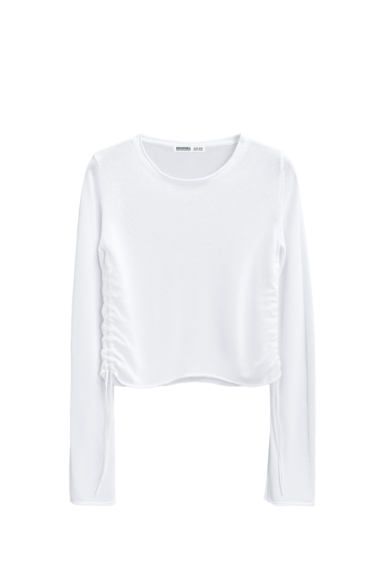 Трикотажный топ из вискозы. Модель прямого кроя, с длинным рукавом, небольшими разрезами на манжетах и круглым вырезом горловины. Кулиски по бокам изделия позволяют регулировать длину и создавать драпировку.