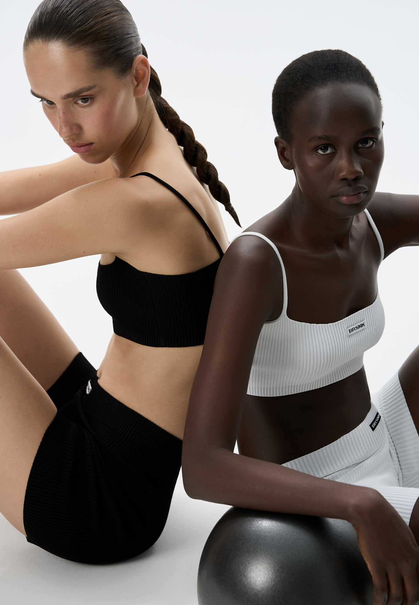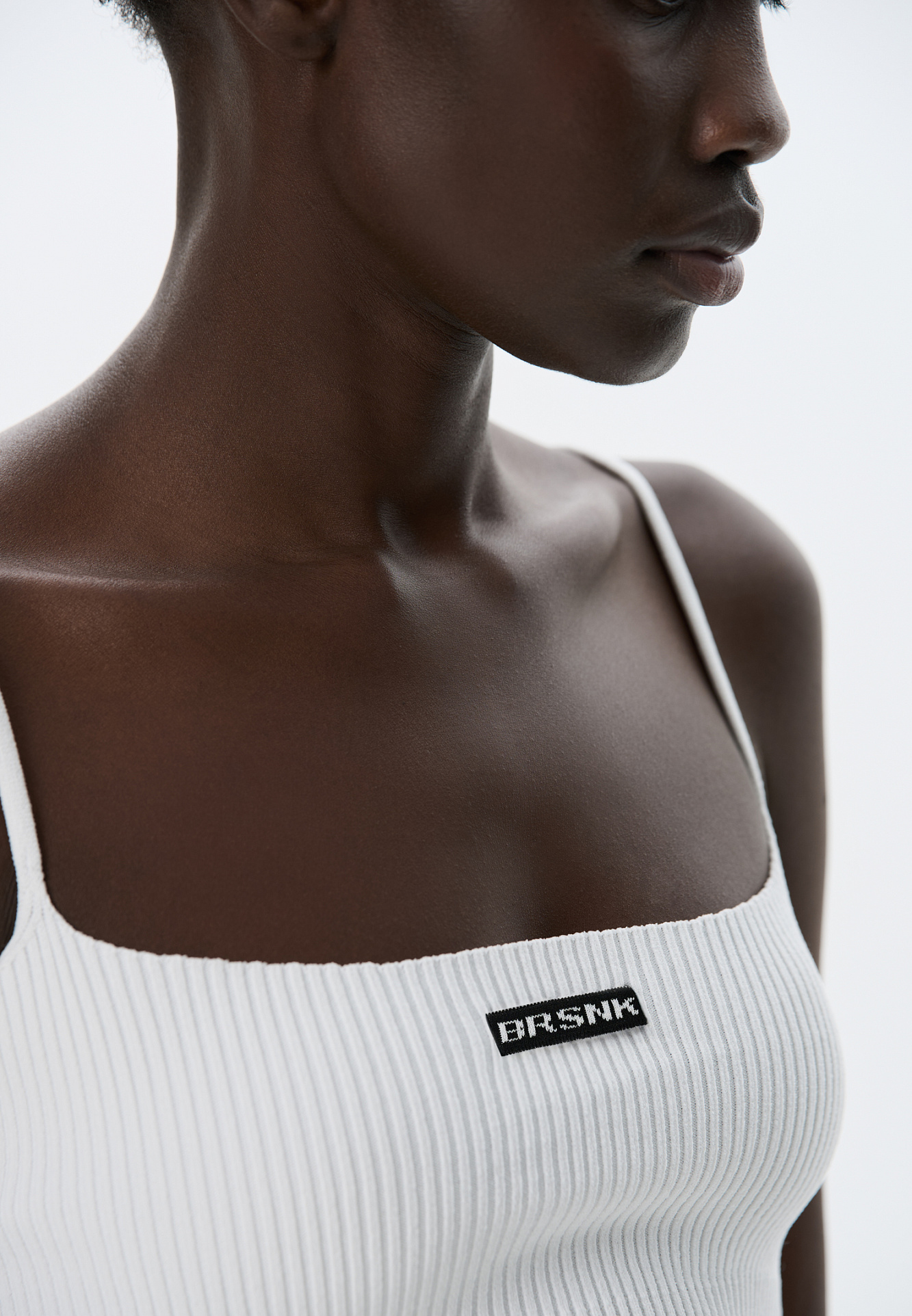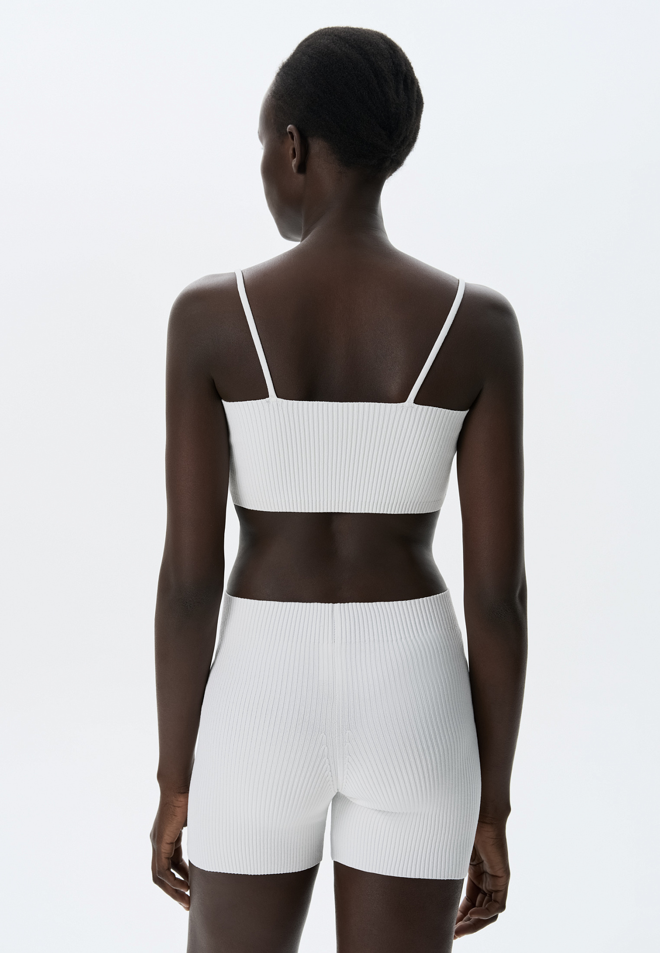 Трикотажный короткий топ из вискозы в спортивном стиле. Модель выполнена в рубчик на тонких бретельках. Брендированный жаккард на груди. Дополнить образ можно шортами в таком же стиле.