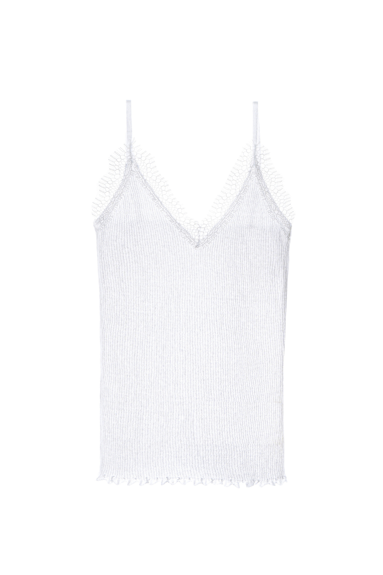 Трикотажный топ, выполненный из тонкого хлопка. Модель в рубчик на тонких бретельках и глубоким вырезом декольте. Изделие декорировано кружевом.
