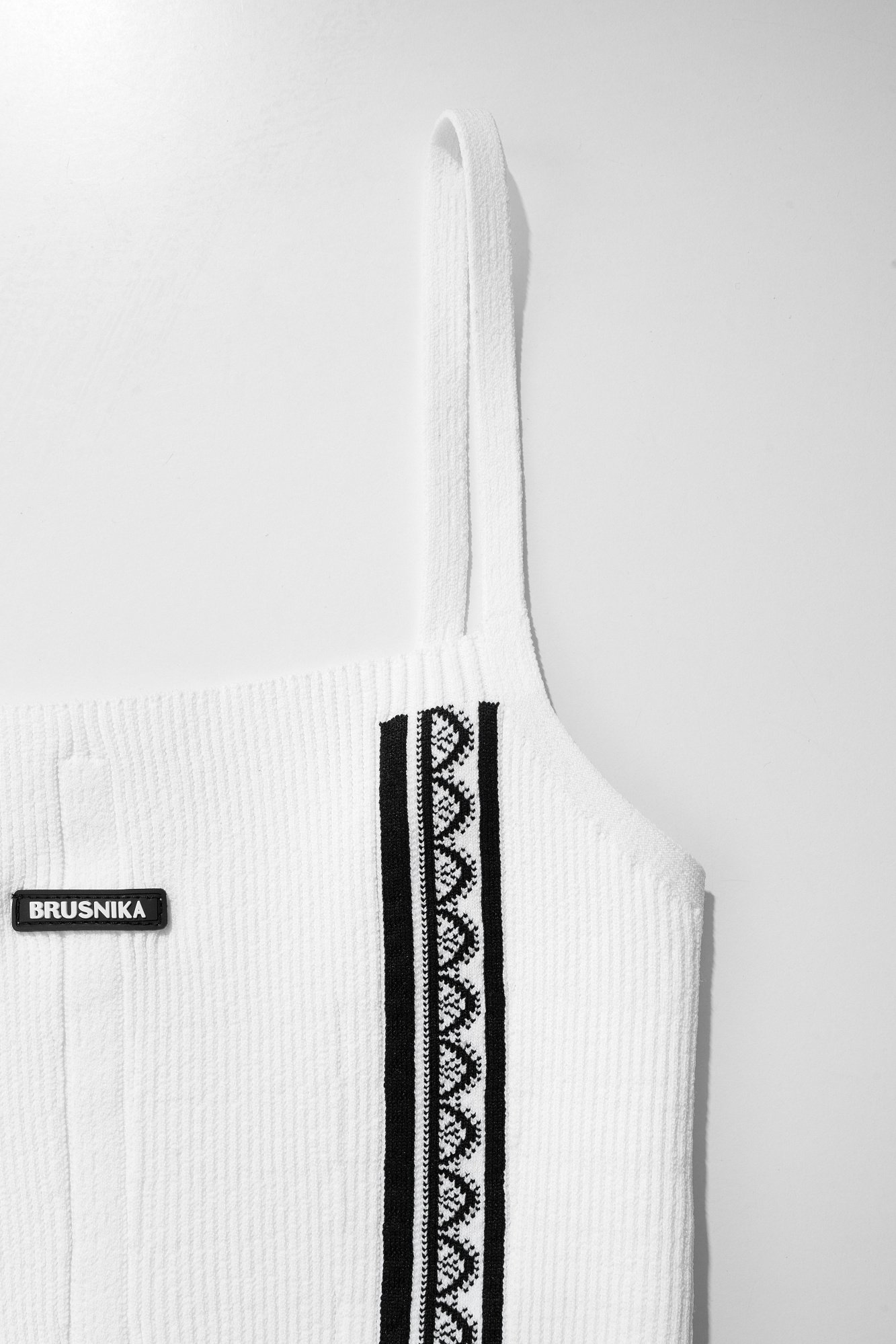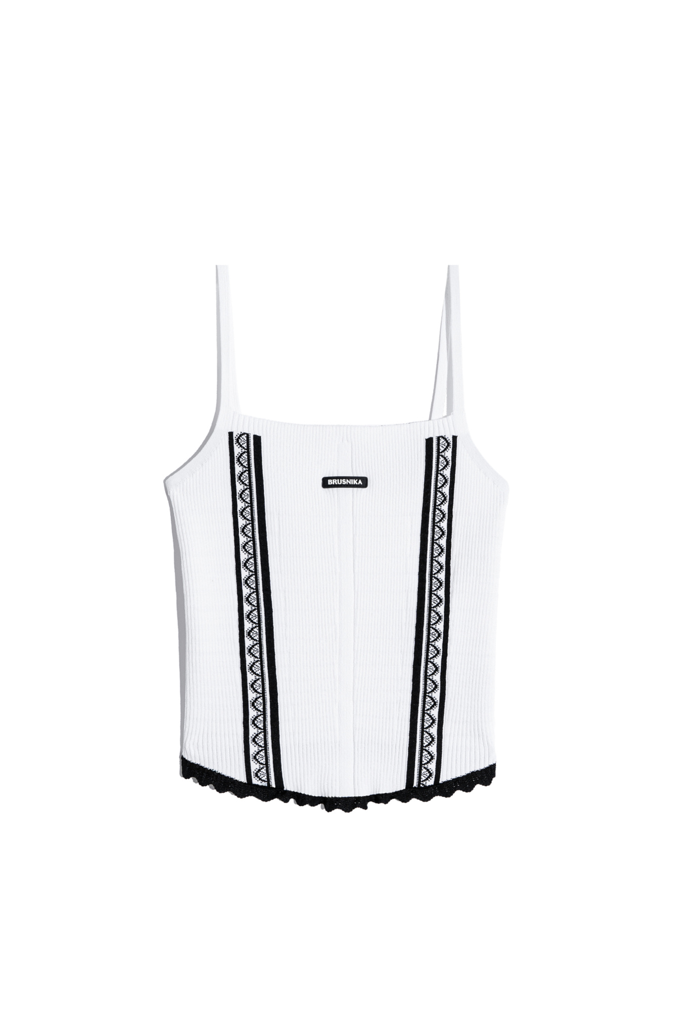 Трикотажный топ из вискозы. Модель по фигуре, на тонких бретельках. Изделие декорировано жаккардовым узором в виде кружева и ажуром контрастного цвета по низу изделия.