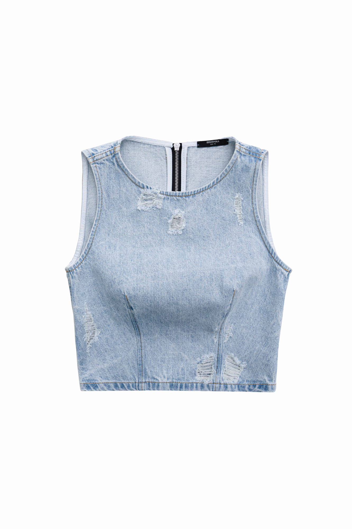 Джинсовый удлиненный топ с разрезами в стиле гранж. Модель приталенного силуэта, без рукавов. Дополнить образ можно юбкой в таком же стиле.