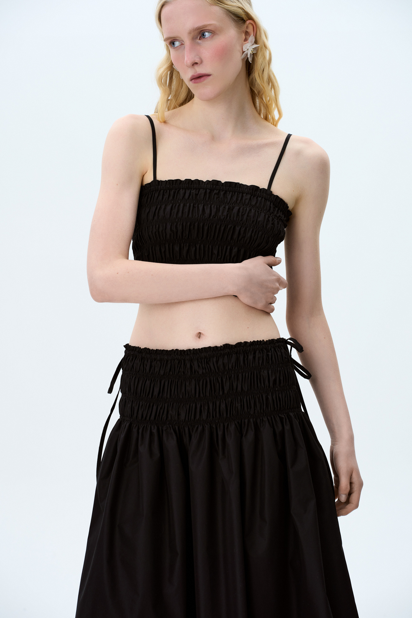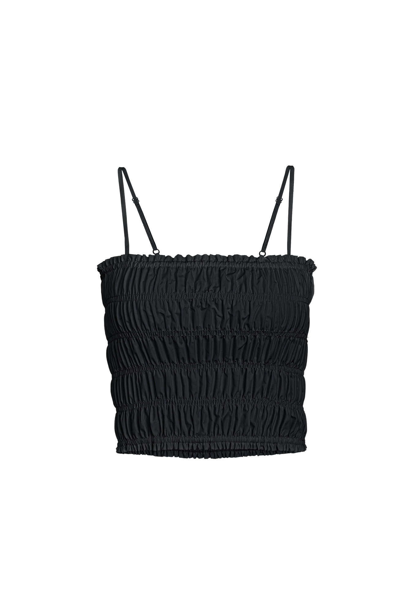 Топ с эластичными сборками на тонких регулируемых бретелях. Дополнить образ можно юбкой в таком же стиле.