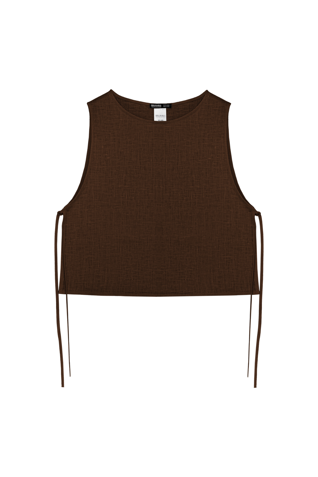 Укороченный топ из 100% льна. Модель свободного кроя, без рукавов, с круглым вырезом горловины. Изделие фиксируется завязками по бокам.