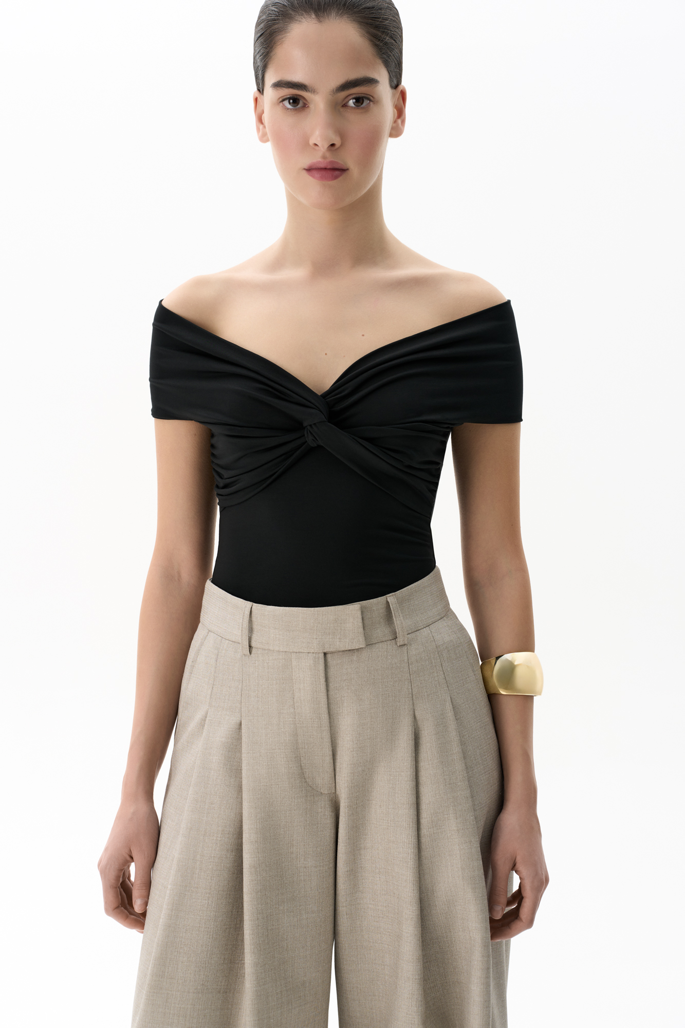 Топ из модала с открытой линией плеч. Модель приталенного силуэта, без рукавов. Изделие декорировано перекрутом на груди и драпировкой на лифе.