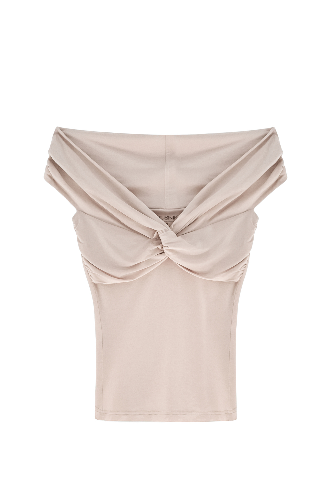 Топ из модала с открытой линией плеч. Модель приталенного силуэта, без рукавов. Изделие декорировано перекрутом на груди и драпировкой на лифе.