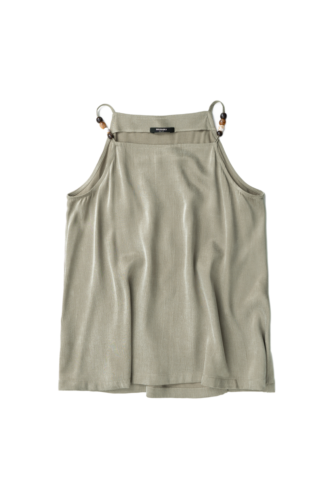 Топ из купры. Модель свободного силуэта, с прямым неглубоким вырезом, на тонких бретельках, декорированных бусинами.